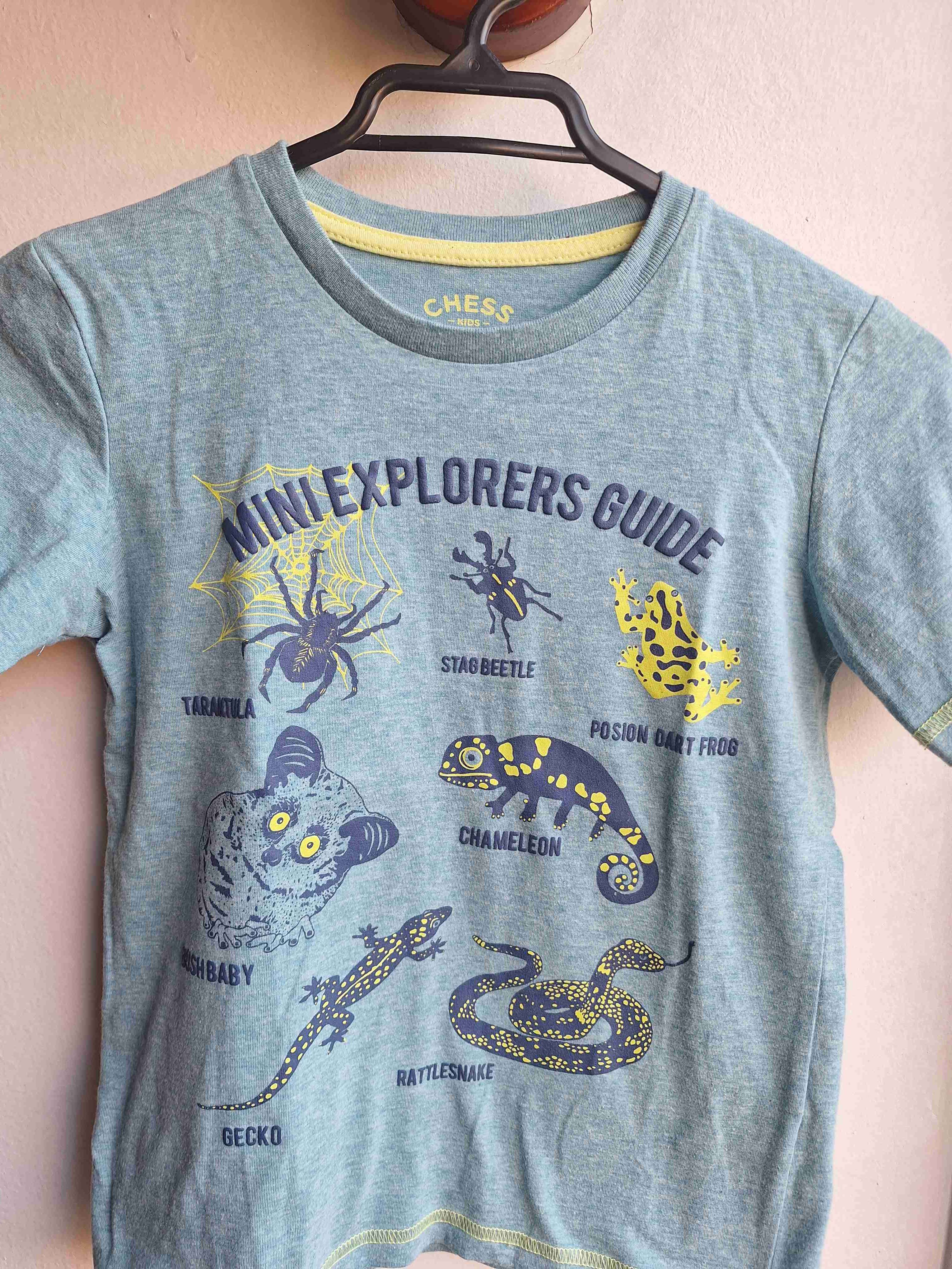 Polera azul para niños con divertido estampado de animales. En buen estado, ideal para la exploración y juego diario.