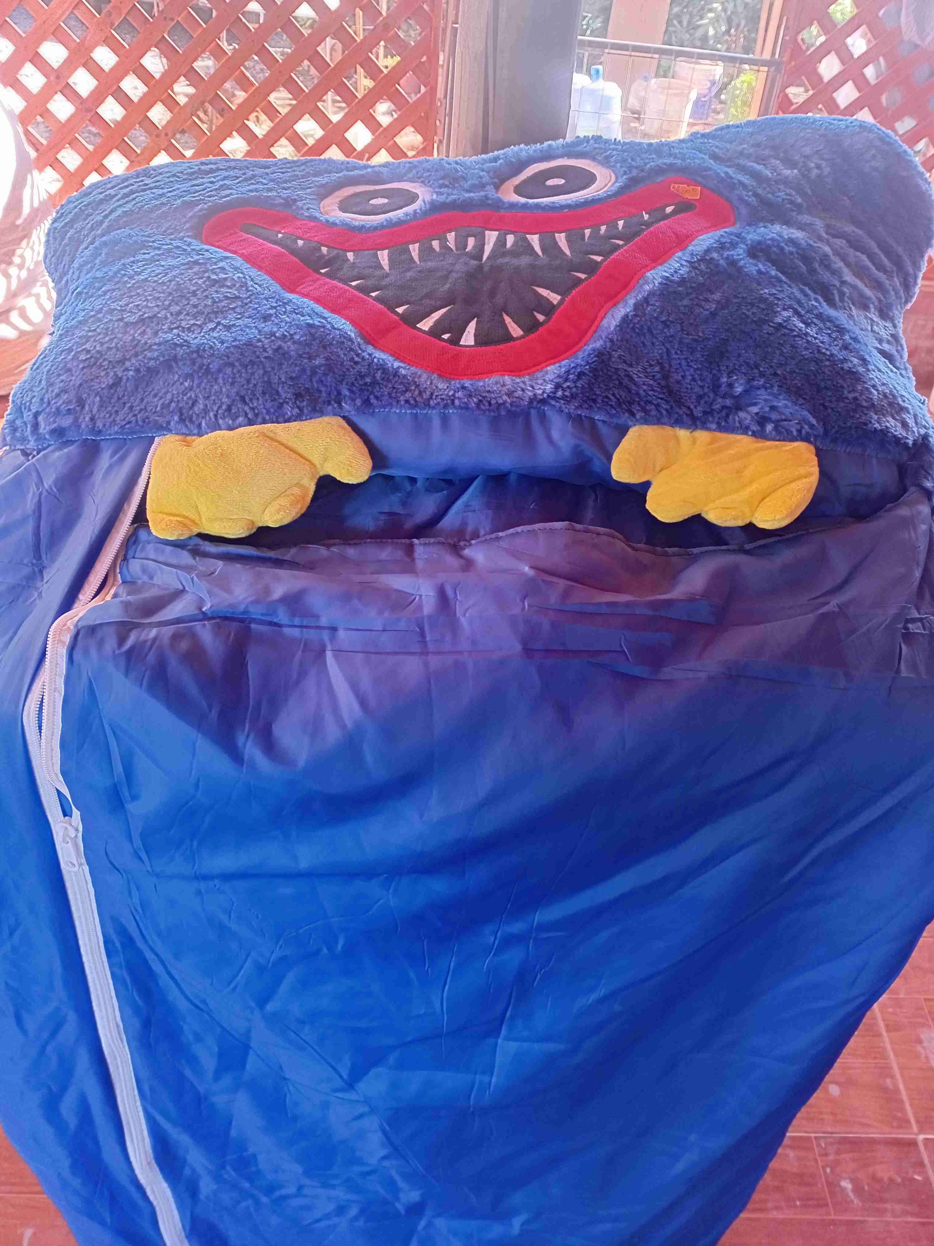 Saco de dormir azul con diseño divertido en la parte superior. Ideal para niños, perfecto estado. Suave y cómodo para noches de camping o pijamadas.