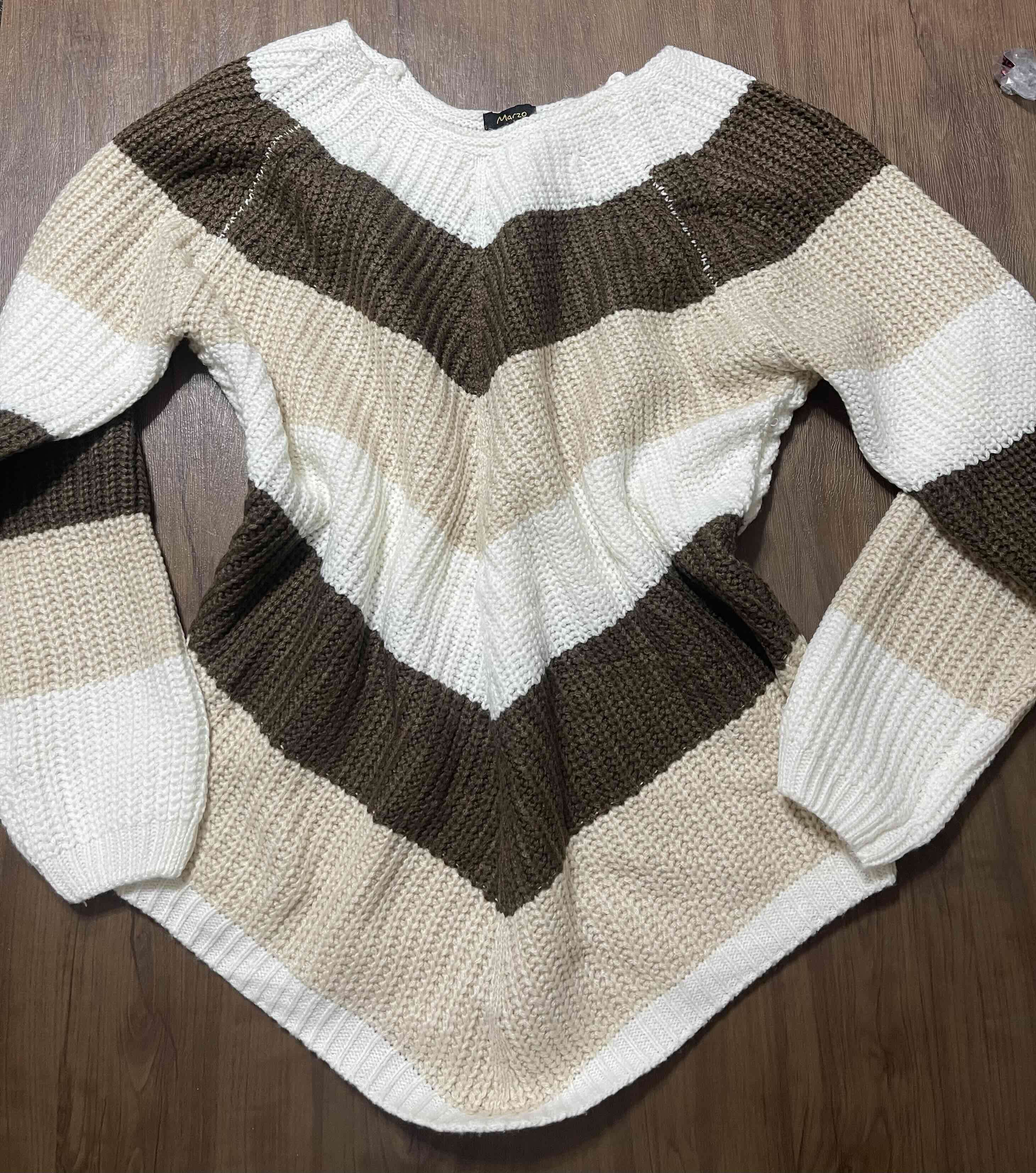 Suéter tejido a rayas, ideal para días fríos, en buen estado general.