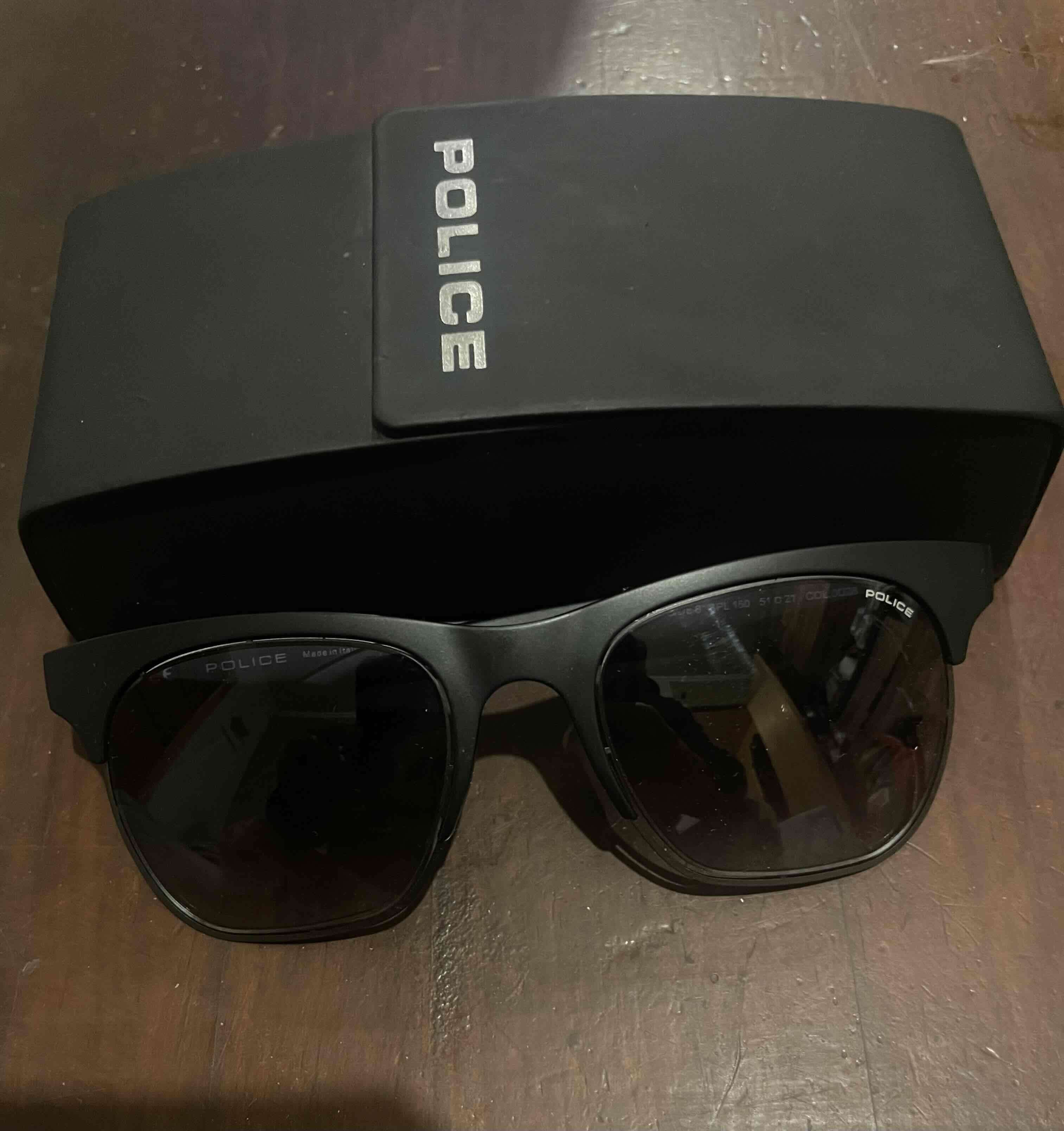 Elegantes gafas de sol negras marca Police. Ideales para un look moderno y sofisticado. En buen estado general.