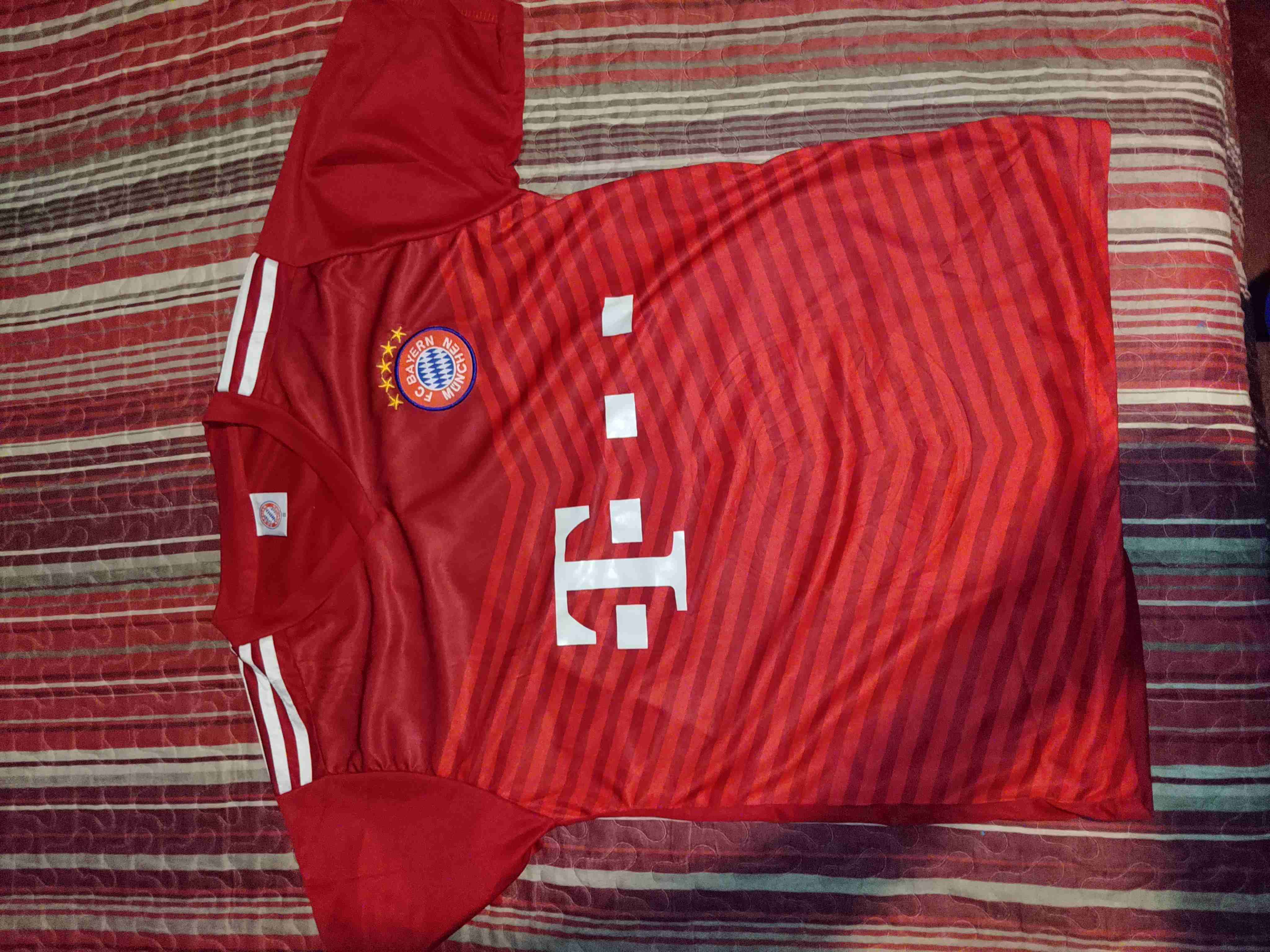 Camiseta de fútbol del Bayern Munich, color rojo vivo y diseño moderno. Ideal para fanáticos y práctica deportiva.talla S