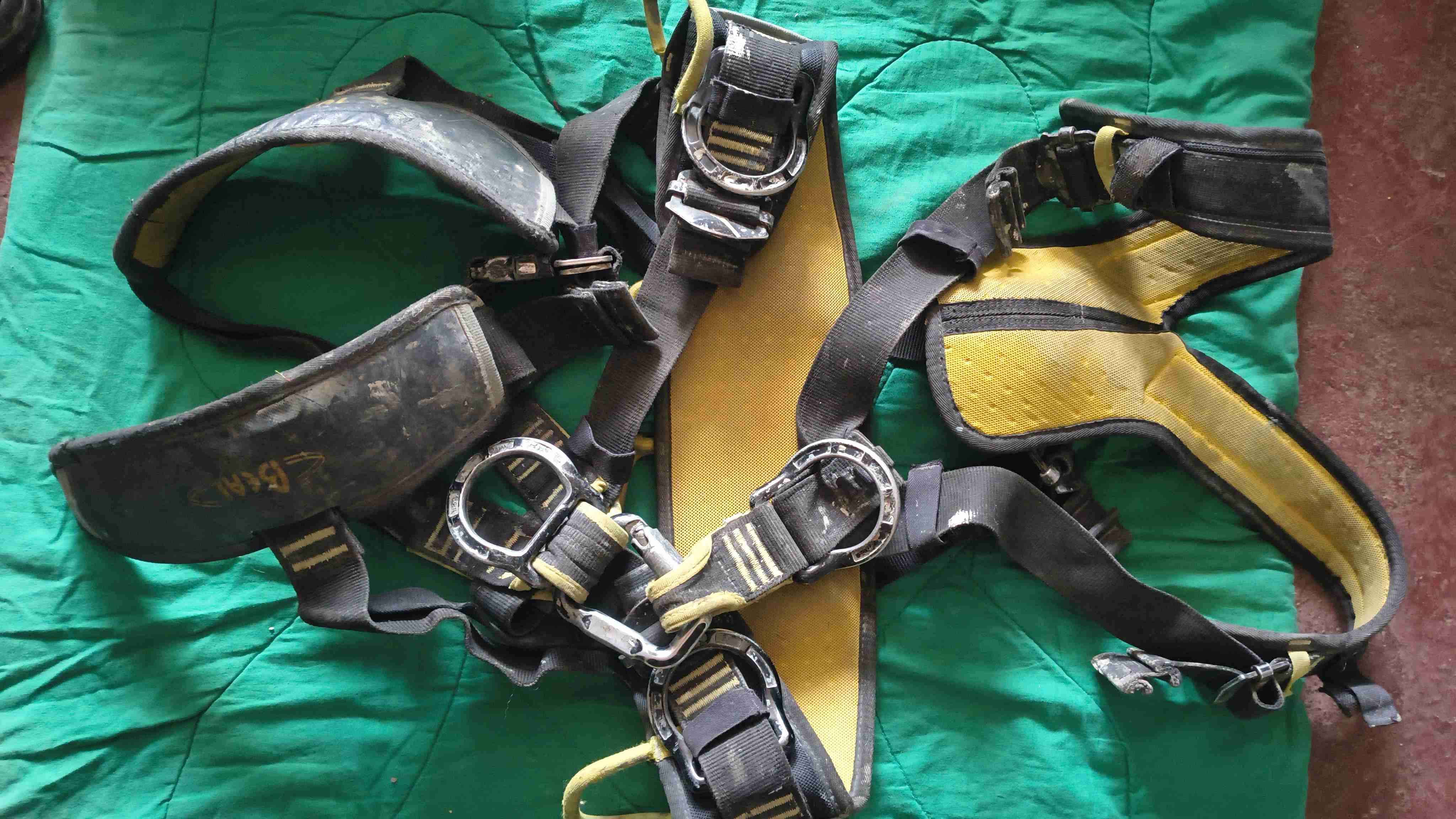 Arnés de seguridad con múltiples ajustes, ideal para trabajos en altura. Presenta signos de uso pero en buen estado.