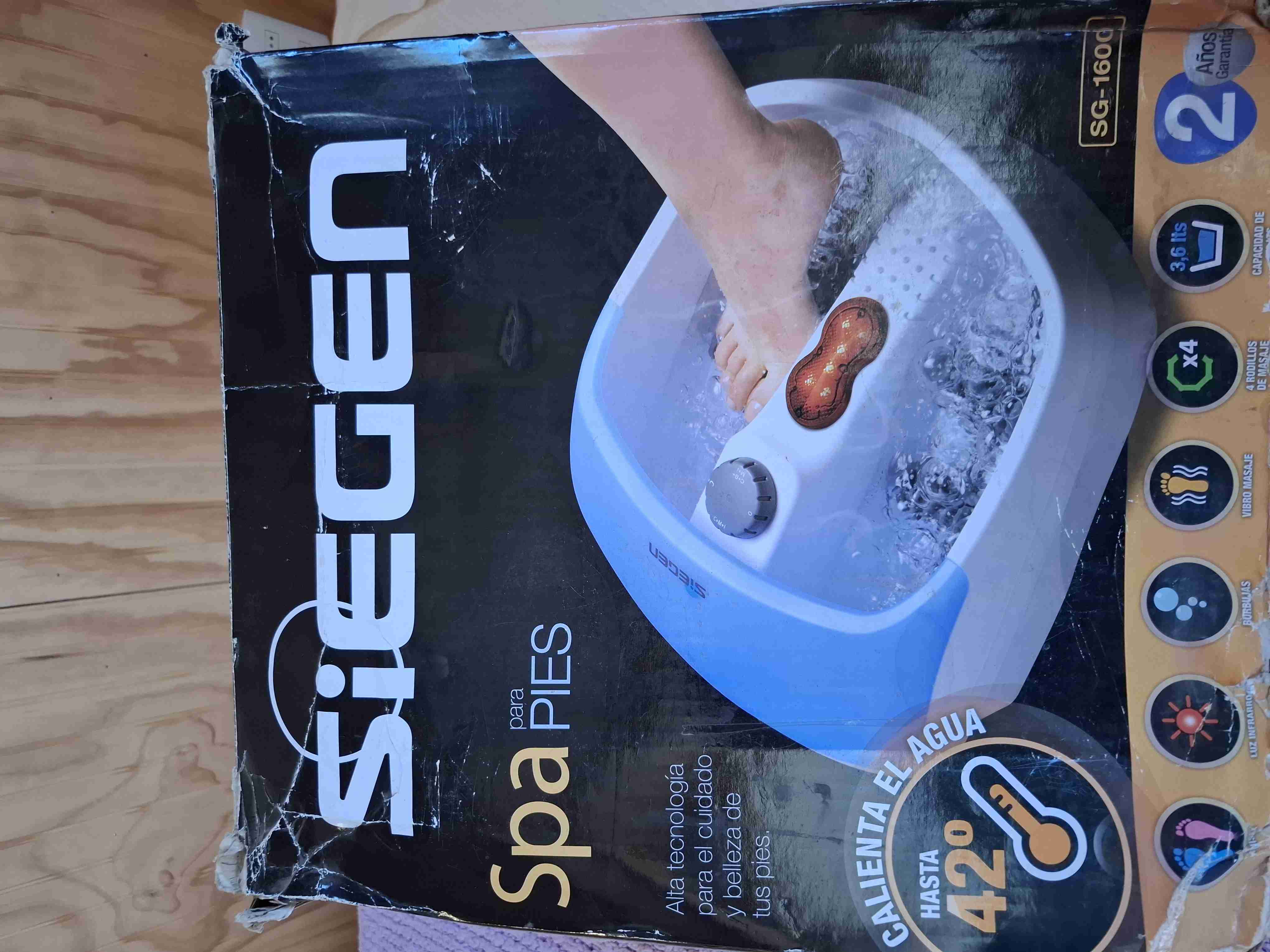 Spa para pies con función de calefacción y masajes. Ideal para relajación y cuidado personal. Caja con desgaste visible.
