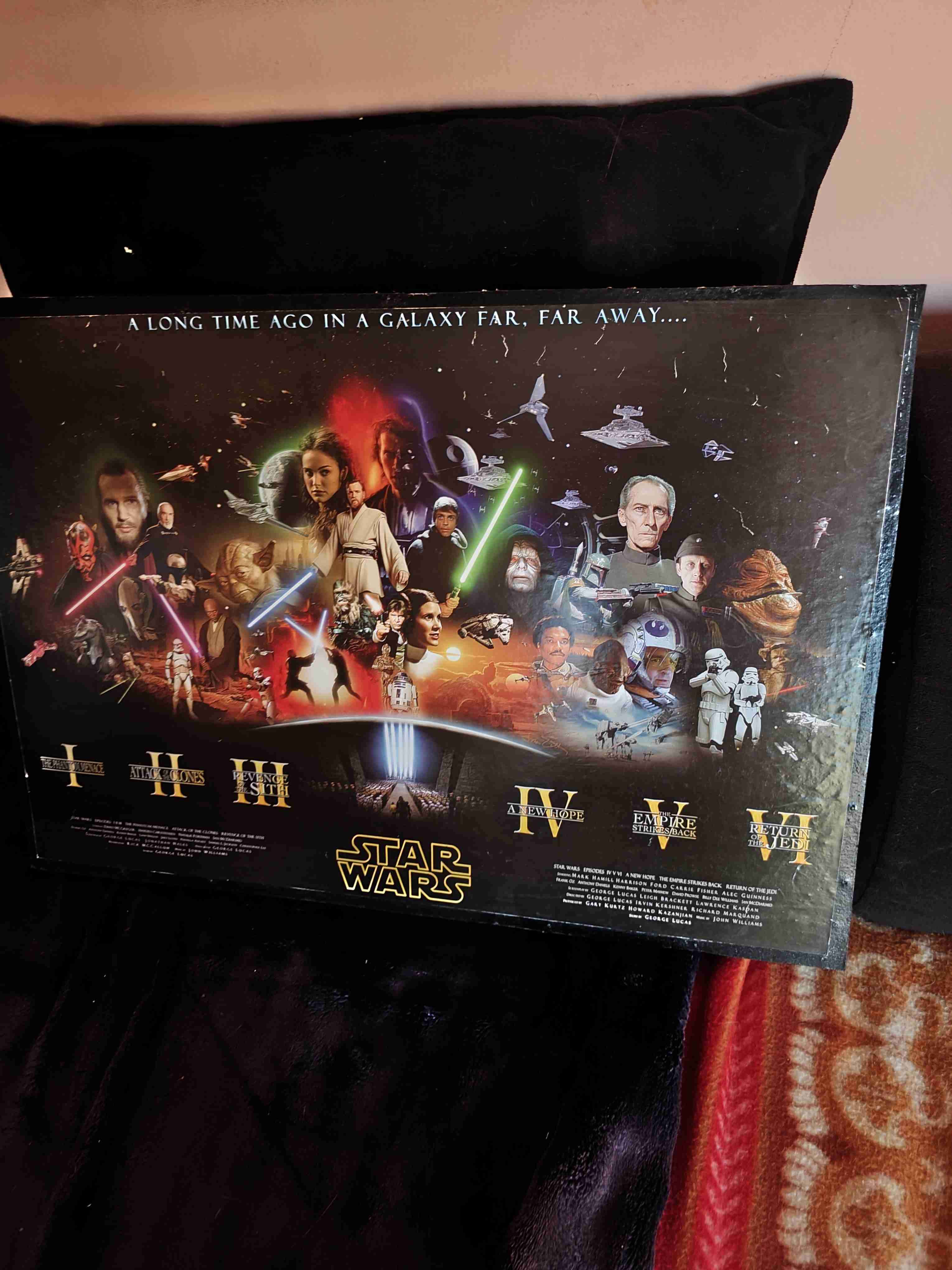 Póster cuadro coleccionable de la saga completa de Star Wars. Ideal para fanáticos, en buen estado.