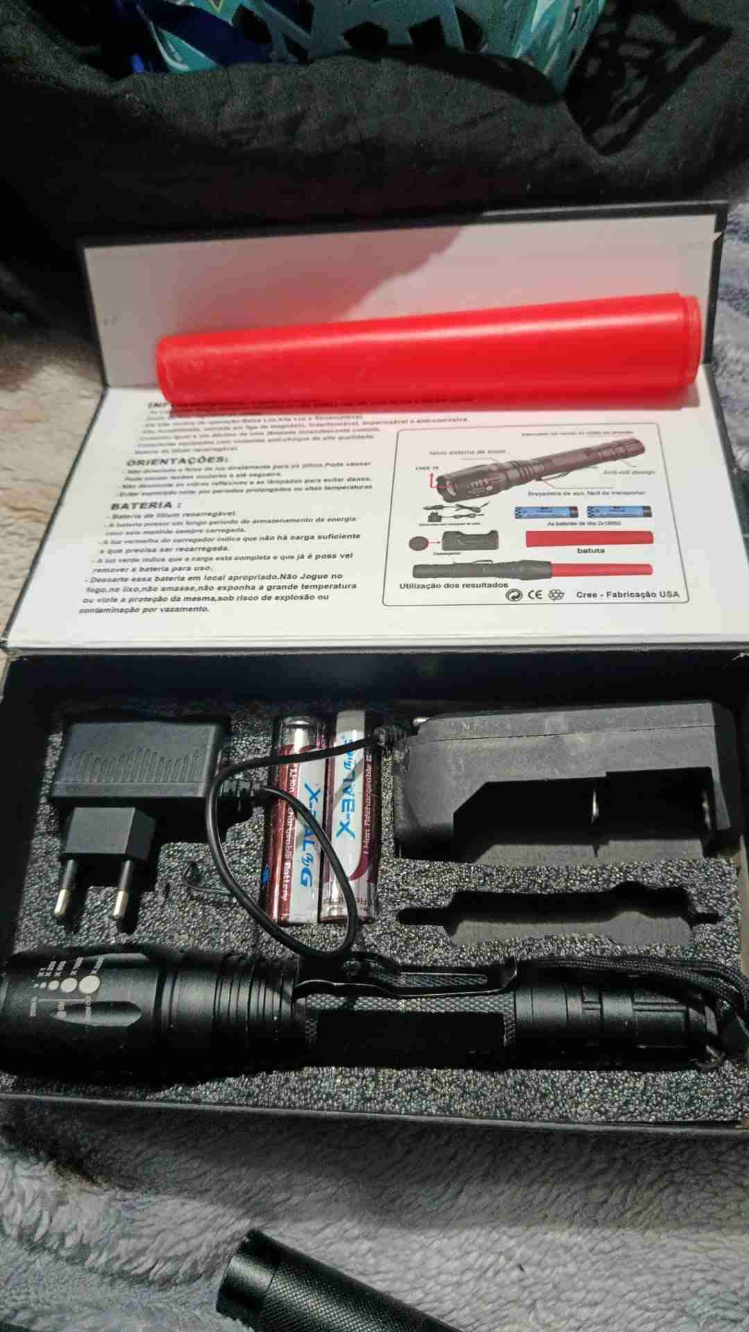 Linterna táctica con baterías recargables y cargador incluido. Ideal para actividades al aire libre. Buen estado.