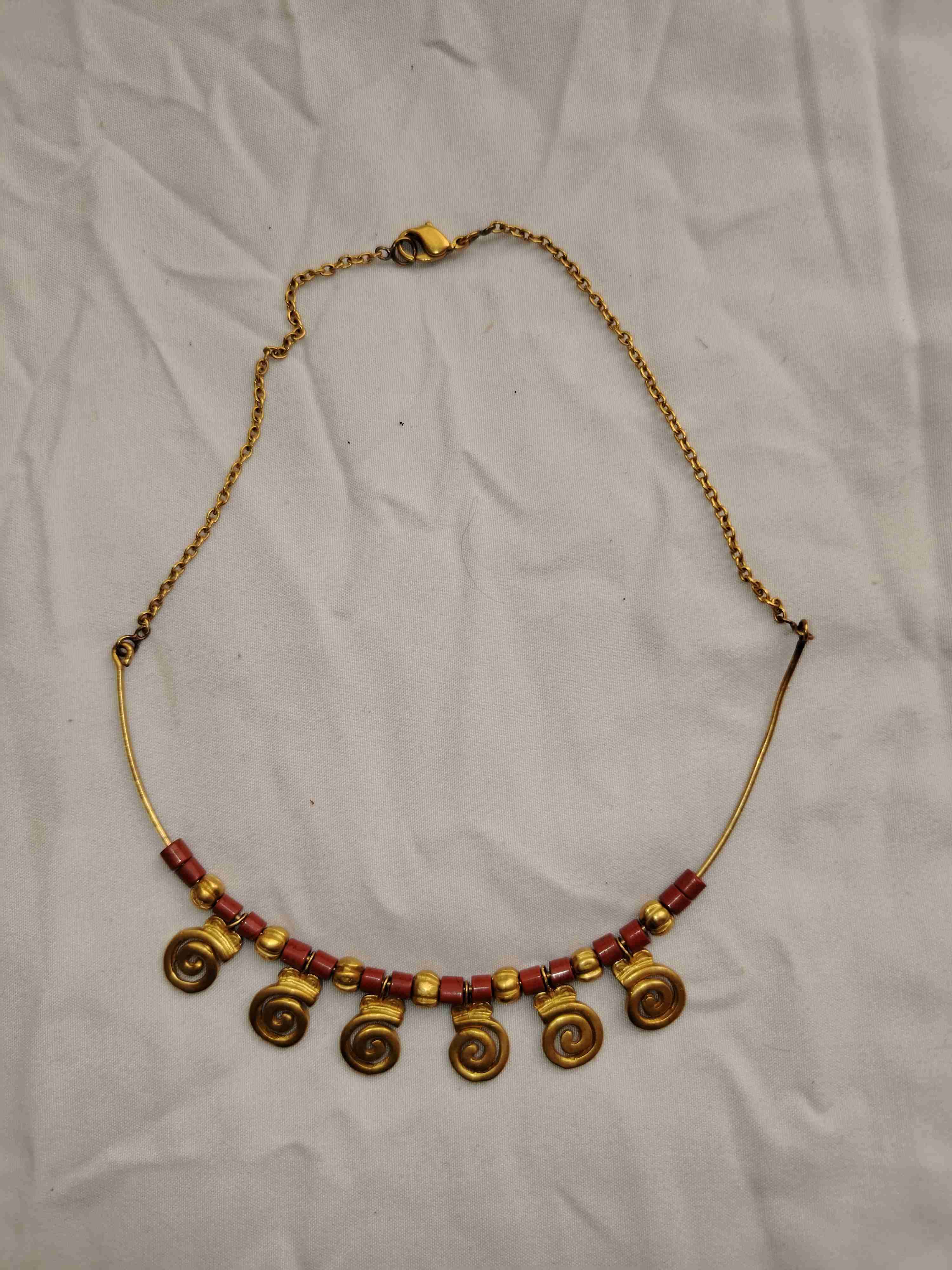 Elegante collar dorado con detalles en espiral, ideal para eventos especiales. Buen estado.