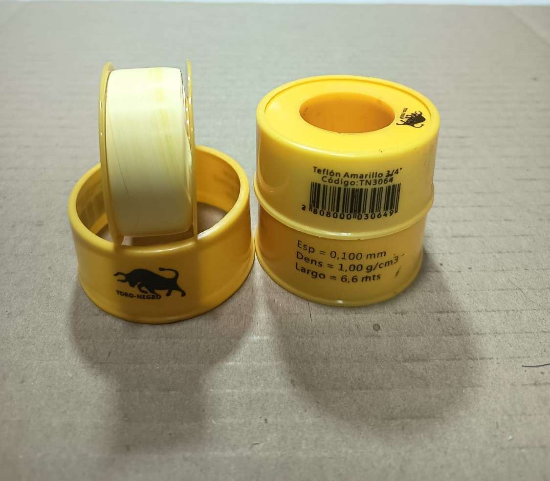 ¡Aprovecha este pack de 3 unidades y asegura tus instalaciones! El teflón amarillo de Toro Negro es de alta densidad, diseñado específicamente para garantizar sellados herméticos y seguros en conexiones de gas licuado o natural. ¿Por qué usar teflón amarillo? A diferencia del blanco, este es más grueso y resistente a los hidrocarburos, cumpliendo con la normativa para evitar fugas en cañerías de gas. Detalles del Pack: Cantidad: 3 rollos. Marca: Toro Negro. Medidas por rollo: 3/4" de ancho x 6.6 metros de largo. Especificaciones: Espesor de 0.100 mm y densidad de 1 g/cm³. Uso: Gasfitería profesional y hogar. Estado: Productos nuevos y sellados.