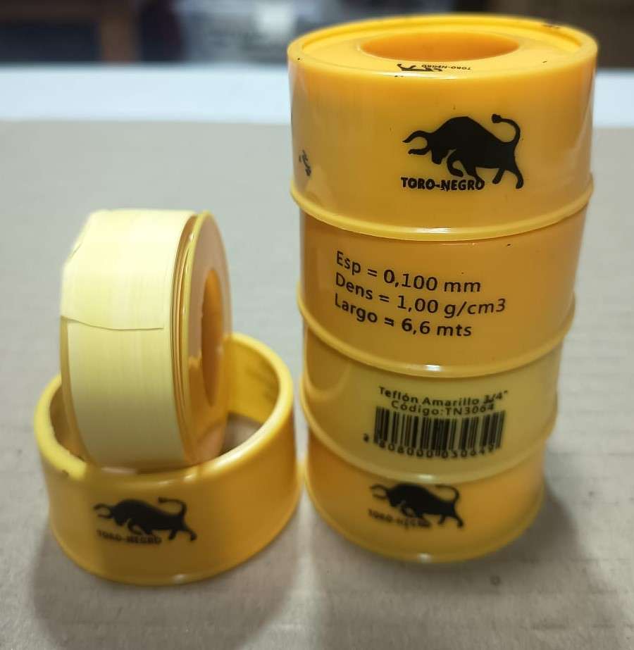 ¡Lleva más por menos con este pack de 5 rollos! El teflón amarillo de alta densidad Toro Negro es la elección profesional para asegurar conexiones de gas sin fugas. Su mayor espesor y densidad lo hacen superior al teflón estándar, facilitando un sellado hermético en menos vueltas. Detalles del Pack: Contenido: 5 unidades de teflón amarillo. Marca: Toro Negro. Medidas por rollo: 3/4" pulgadas x 6.6 metros de largo. Especificaciones técnicas: Espesor de 0.100 mm / Densidad de 1 g/cm³. Aplicaciones: Especial para cañerías de gas licuado (GLP), gas natural y conexiones de alta exigencia. Estado: Productos nuevos y sellados.