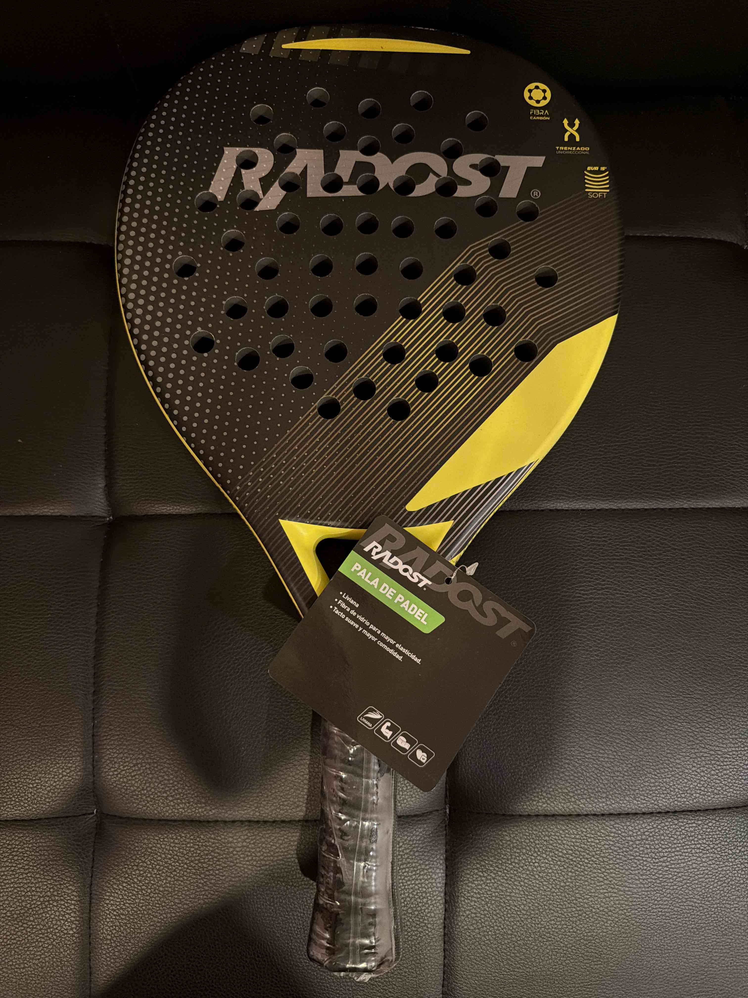 Pala de padel Radost en color negro y amarillo, ideal para jugadores avanzados. Es ligera y resistente. Esta nueva.