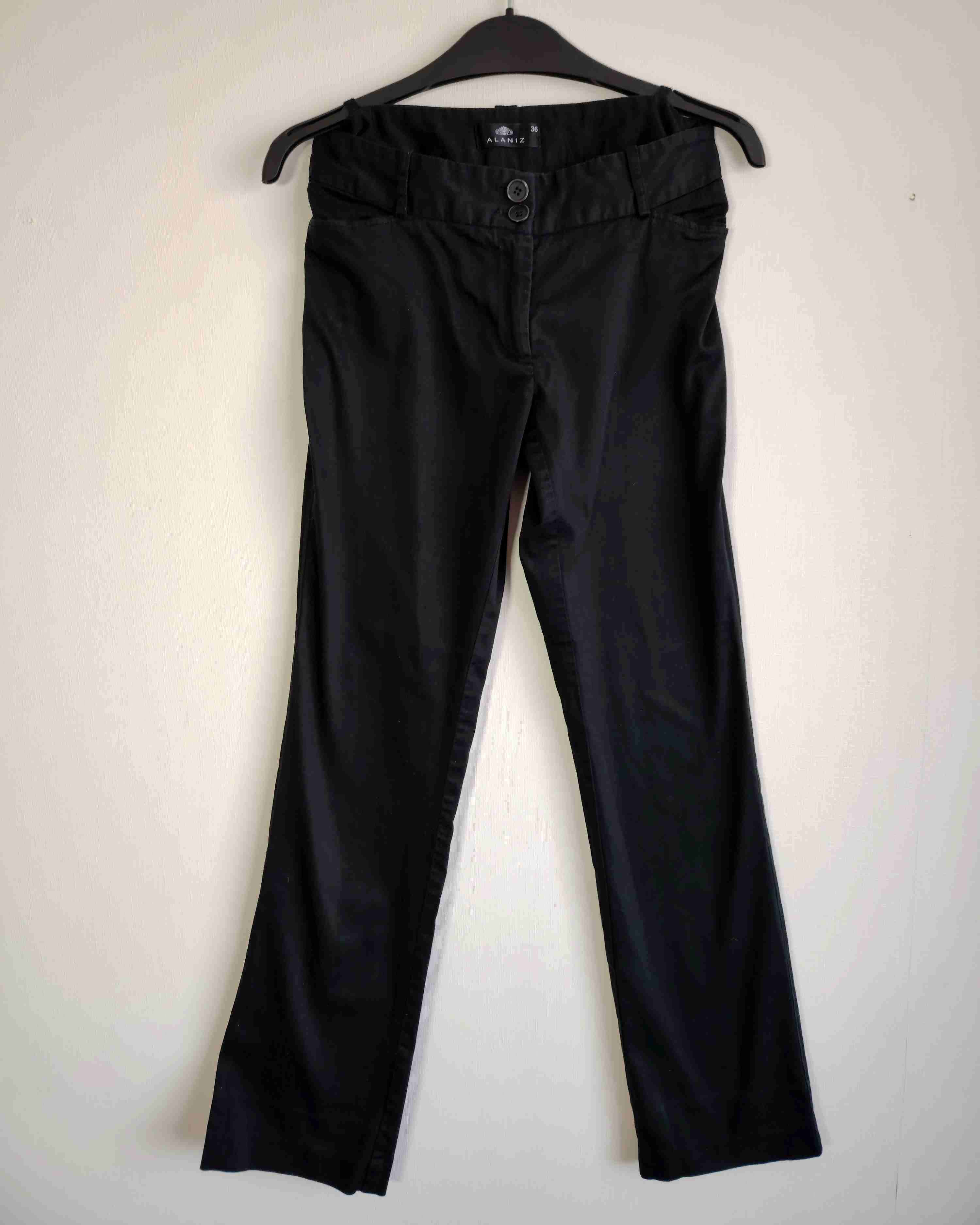 Pantalón negro con detalle en la parte baja. Marca: Alaniz Talla: 36 Medidas: largo total:102 cm - cintura: 68 cm - cadera: 86 cm. Detalle: línea de doblés marcada.