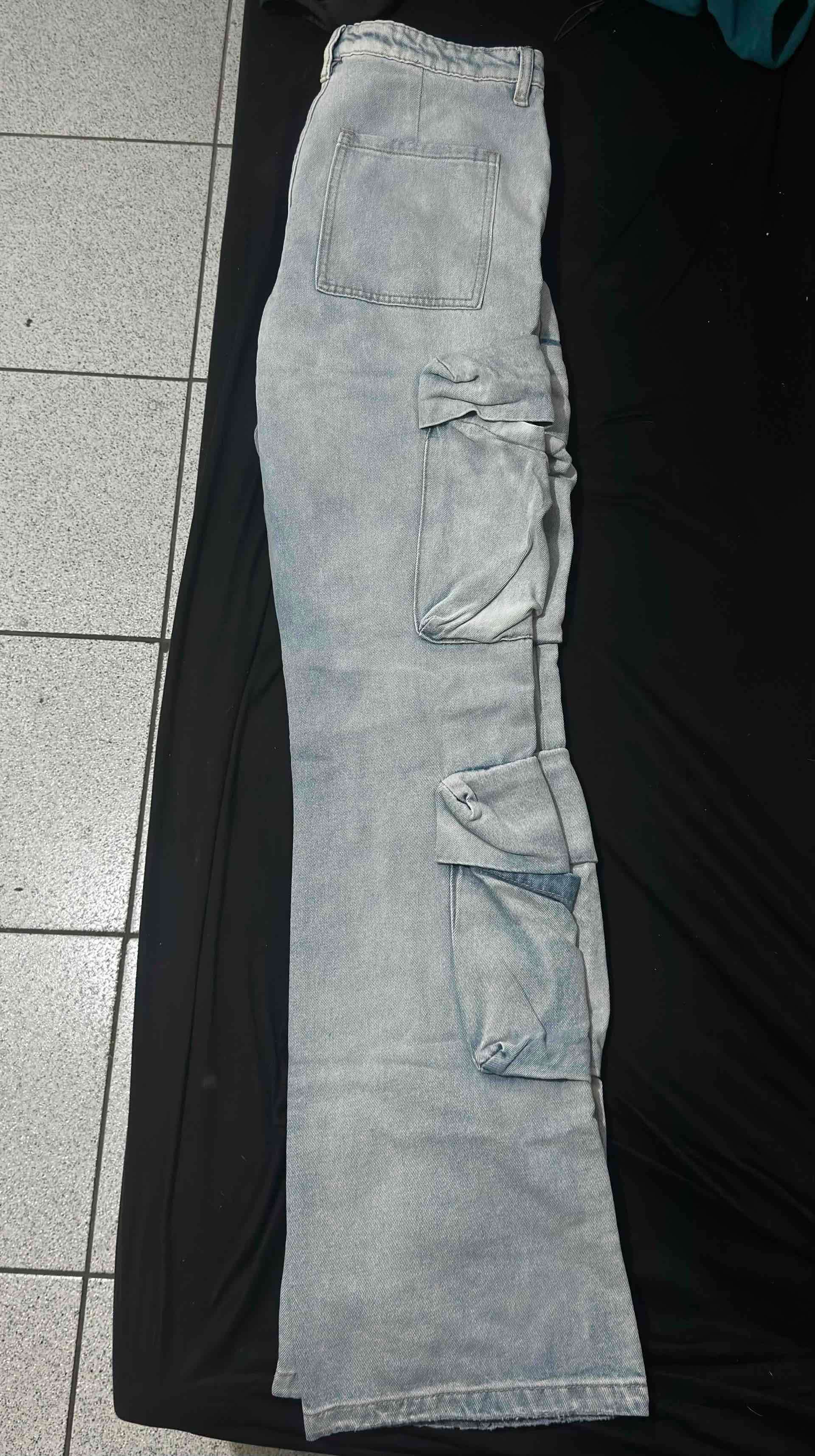 Pantalón cargo color gris con múltiples bolsillos. En buen estado, ideal para un look casual y funcional.