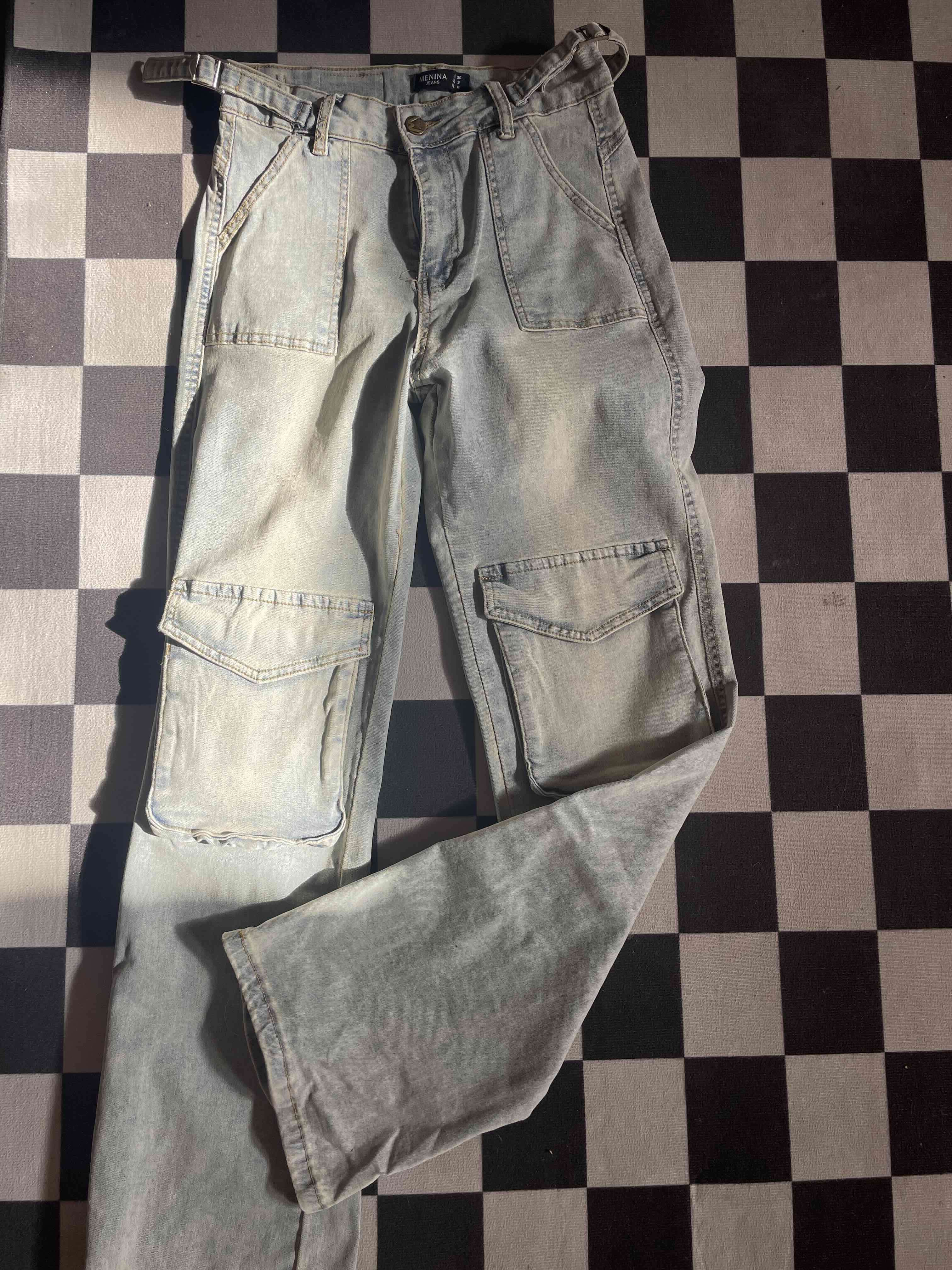 Pantalón cargo de color jeans claro con bolsillos amplios. Perfecto para un look casual y cómodo. Estado general bueno.