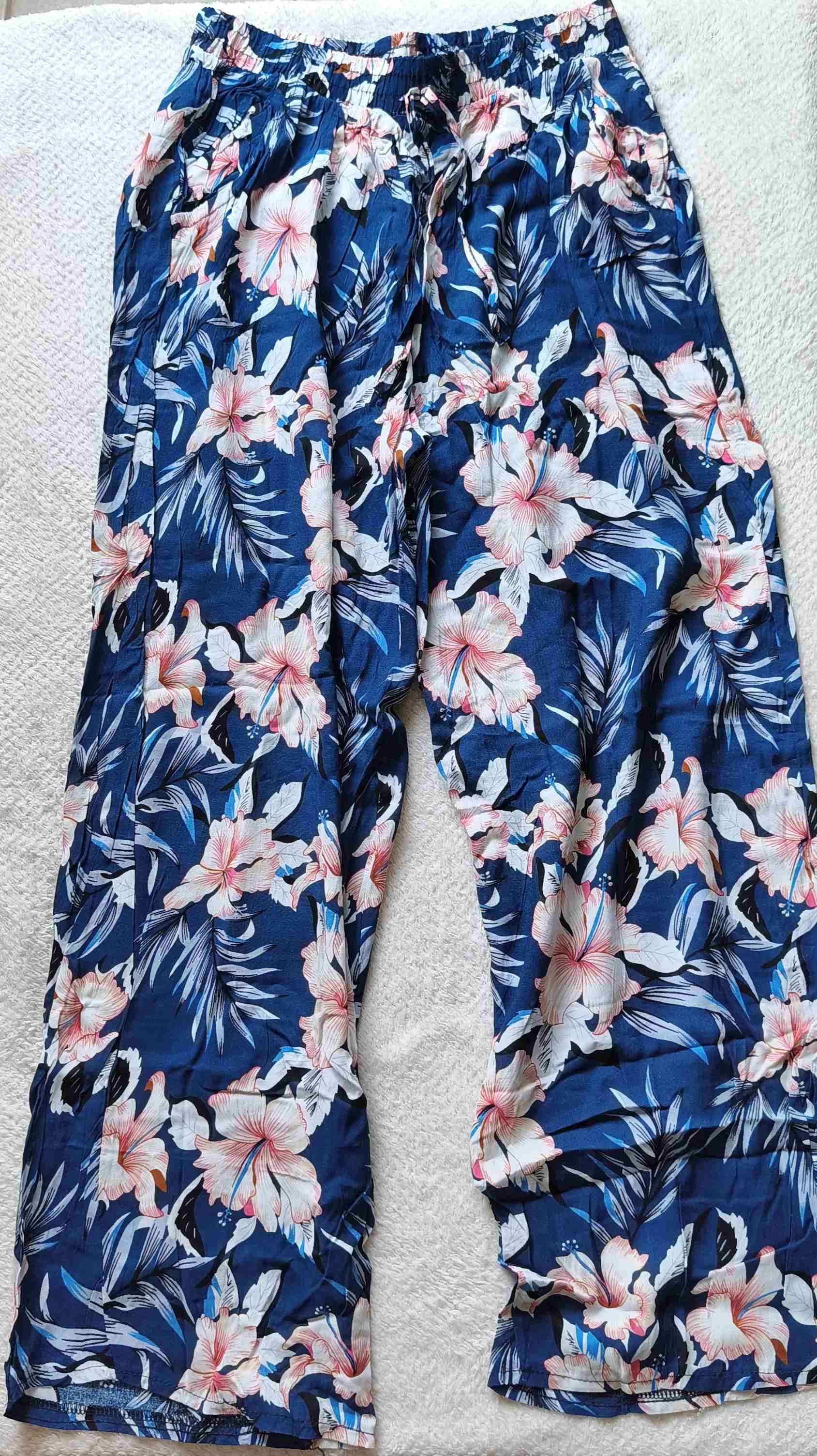 Pantalón con estampado floral tropical en tonos azules (calce holgado), tela fluida,ideales para el verano. En buen estado y cómodo para el día a día.