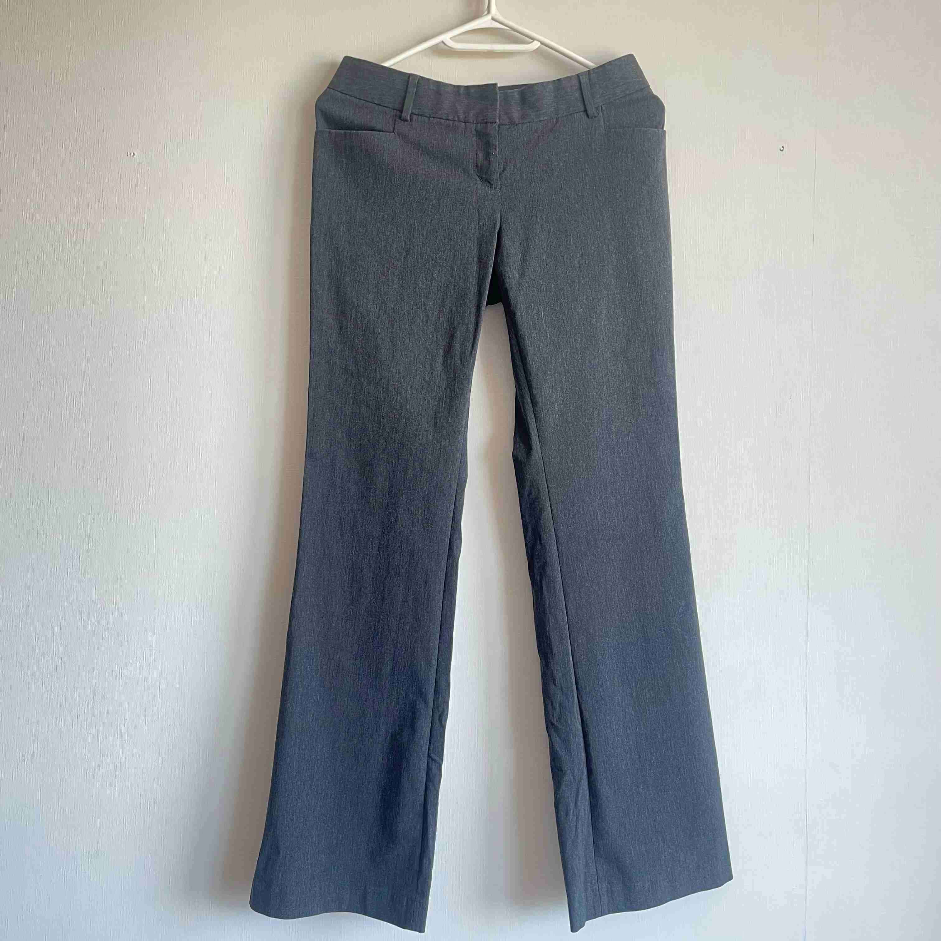 Pantalón gris tiro bajo, ajustado en la cintura. Marca: Express Disign studio. Medidas: cintura: 70 cm - cadera: 90 cm - largo: 99 cm Materiales: 45% rayón, 20% nylon, 32% poliéster, 3% Lycra