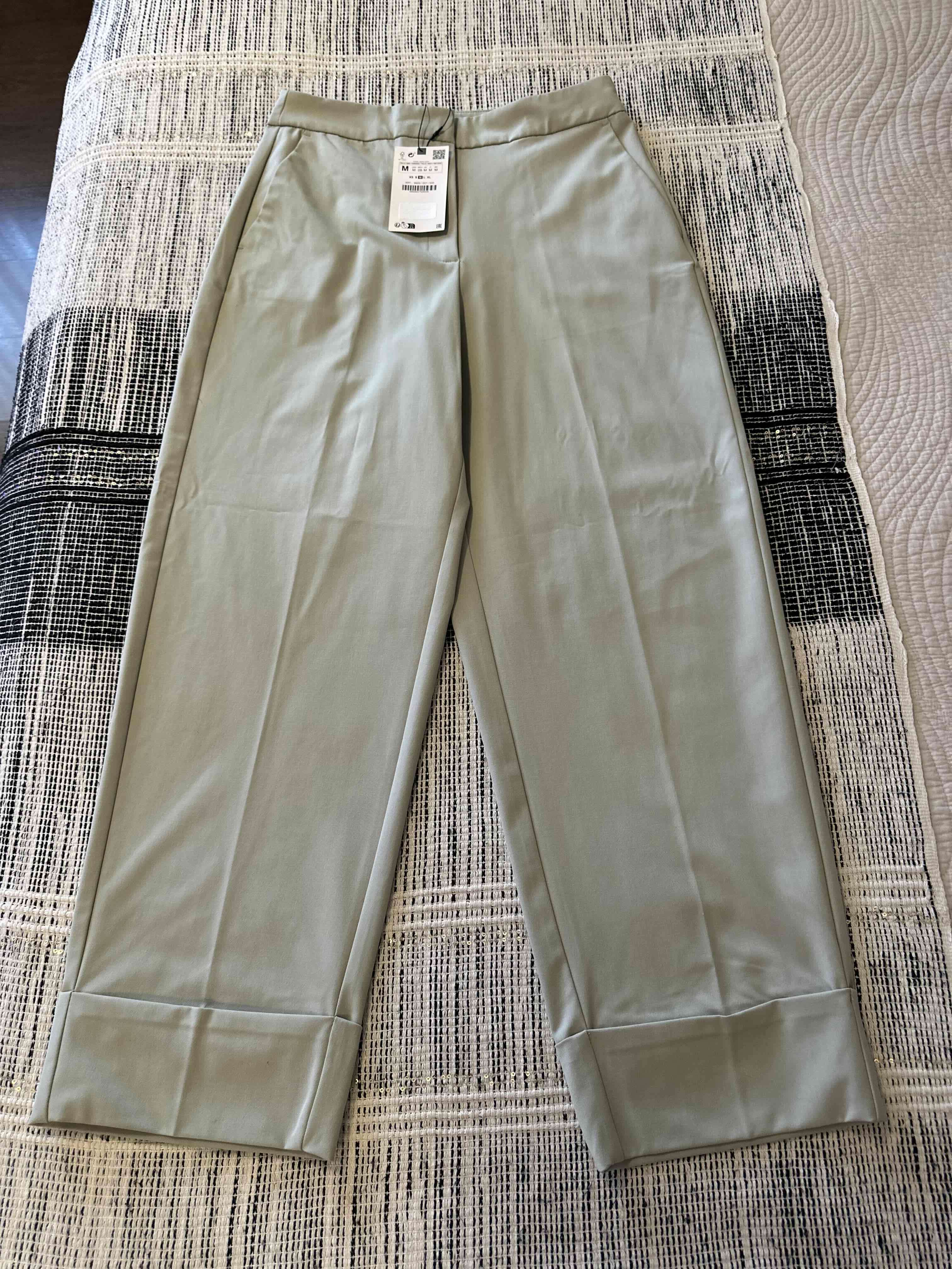 Pantalones color verde clarito, ideales para ocasiones formales. Estado nuevo con etiqueta visible. Talla M, marca Zara