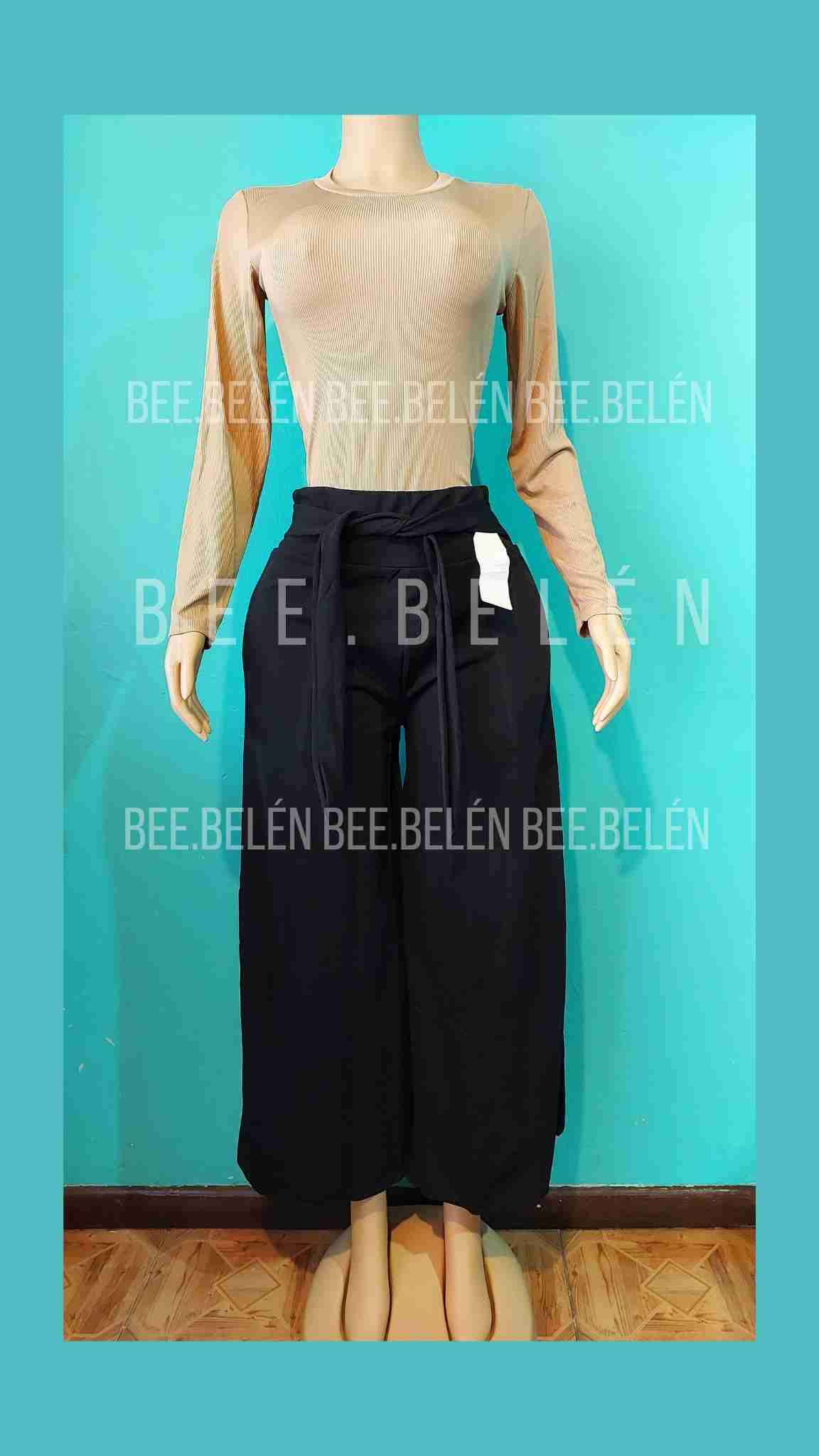 Pantalon palazzo negro con diseño suelto y lazo. Ideal para un look casual o semi-formal. Tiro alto, talla ML