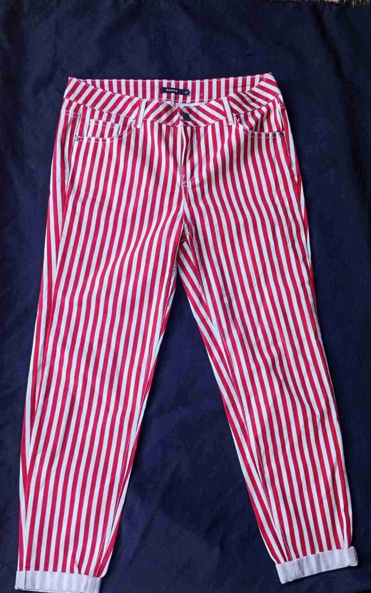 Pantalones de estilo casual con patrón de rayas verticales. Buen estado, ideales para el día a día.