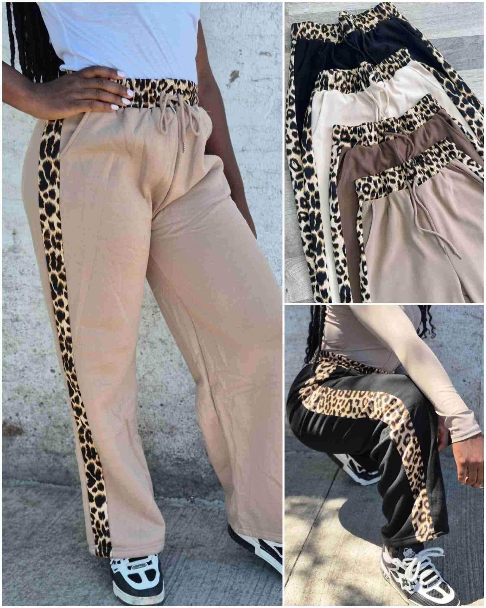Pantalones cómodos perfectos para el día a día, con detalle de leopardo en los costados. Su estado es bueno y muy estiloso para combinar. En tallas M-L. Y. L-XL