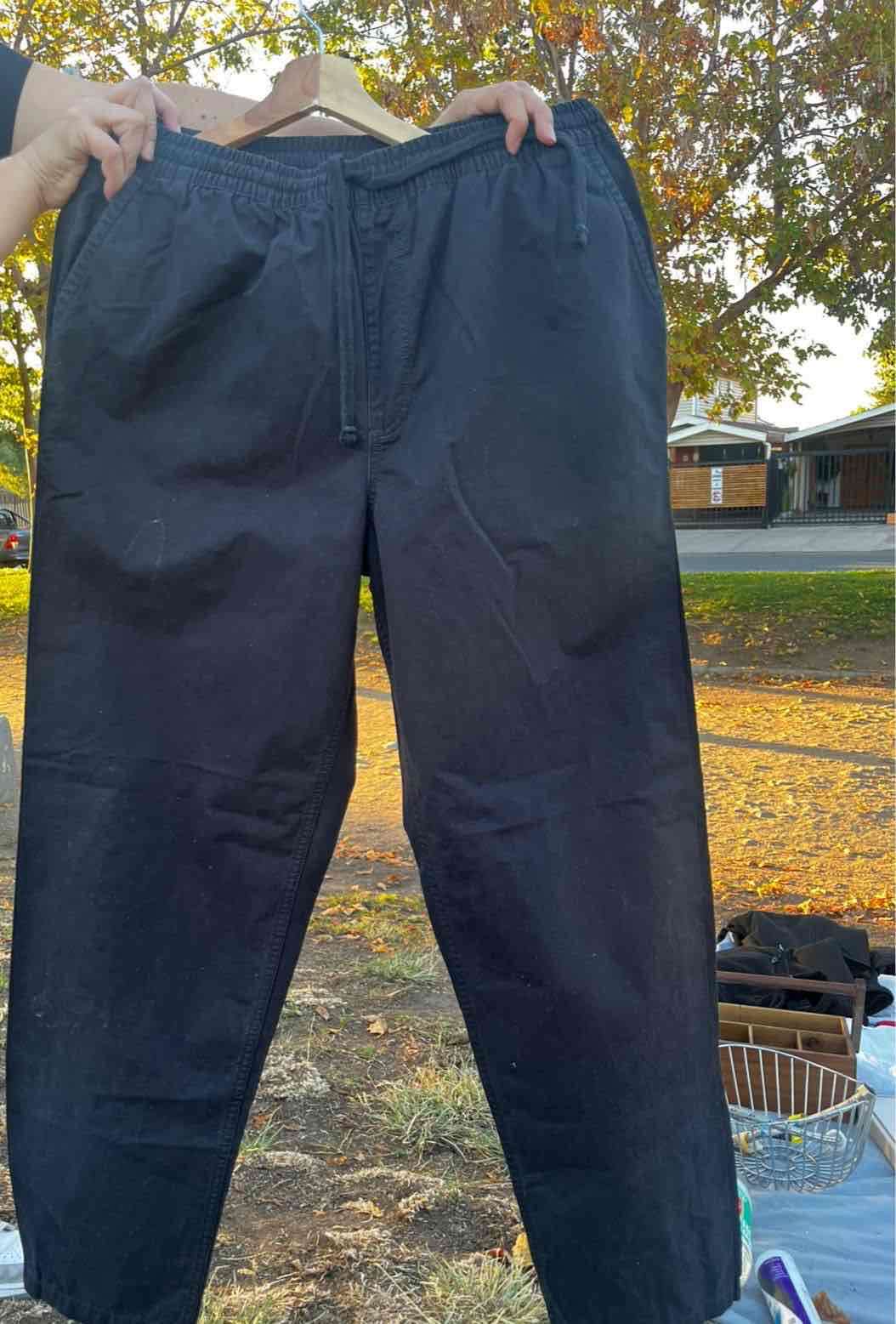 Pantalones cómodos de tela negra, perfectos para el uso diario o ejercicio. En buen estado.