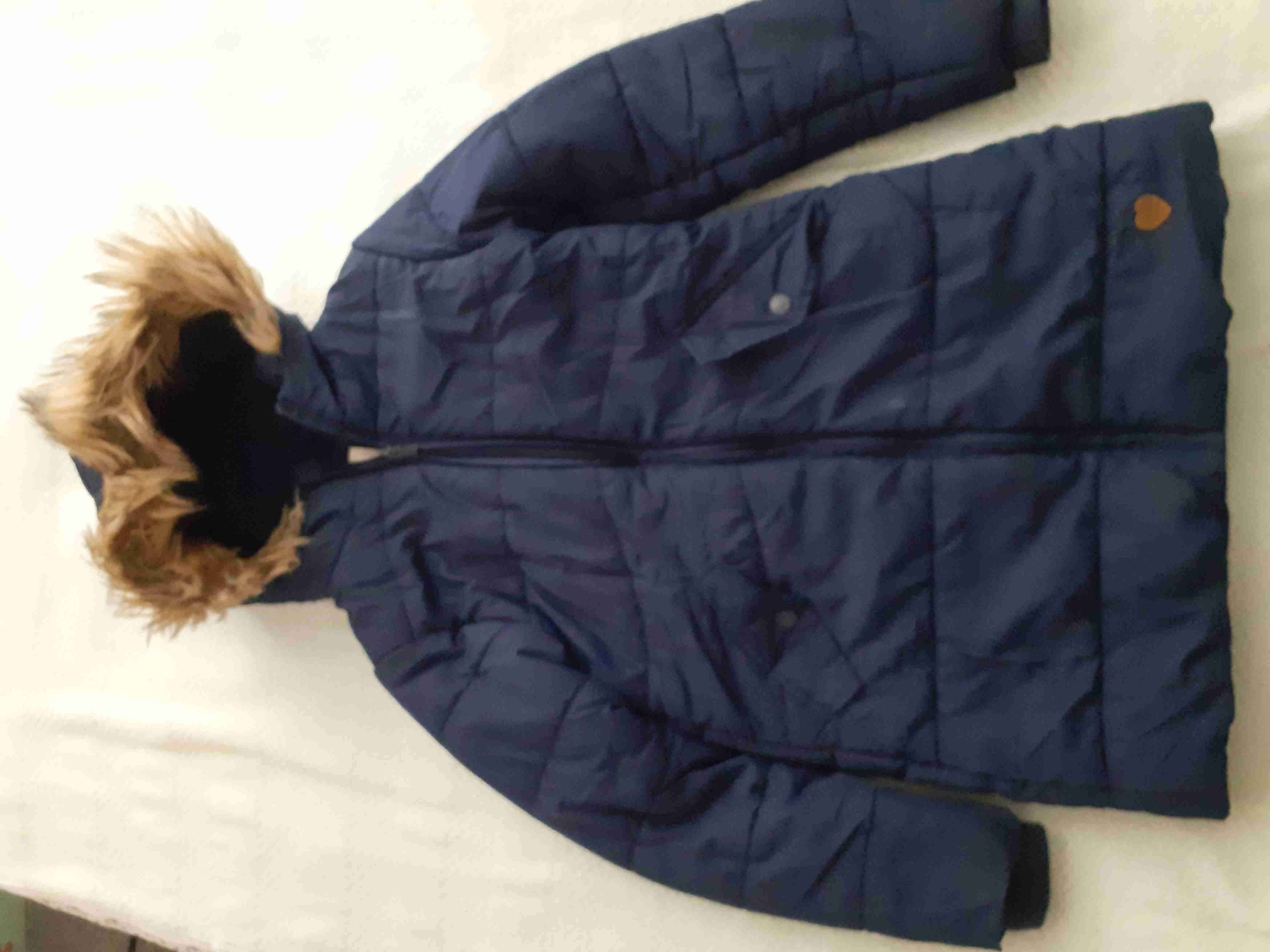 Elegante chaqueta azul con capucha de piel, ideal para el invierno. Buen estado y estilo moderno. Parka azul niña talla 10