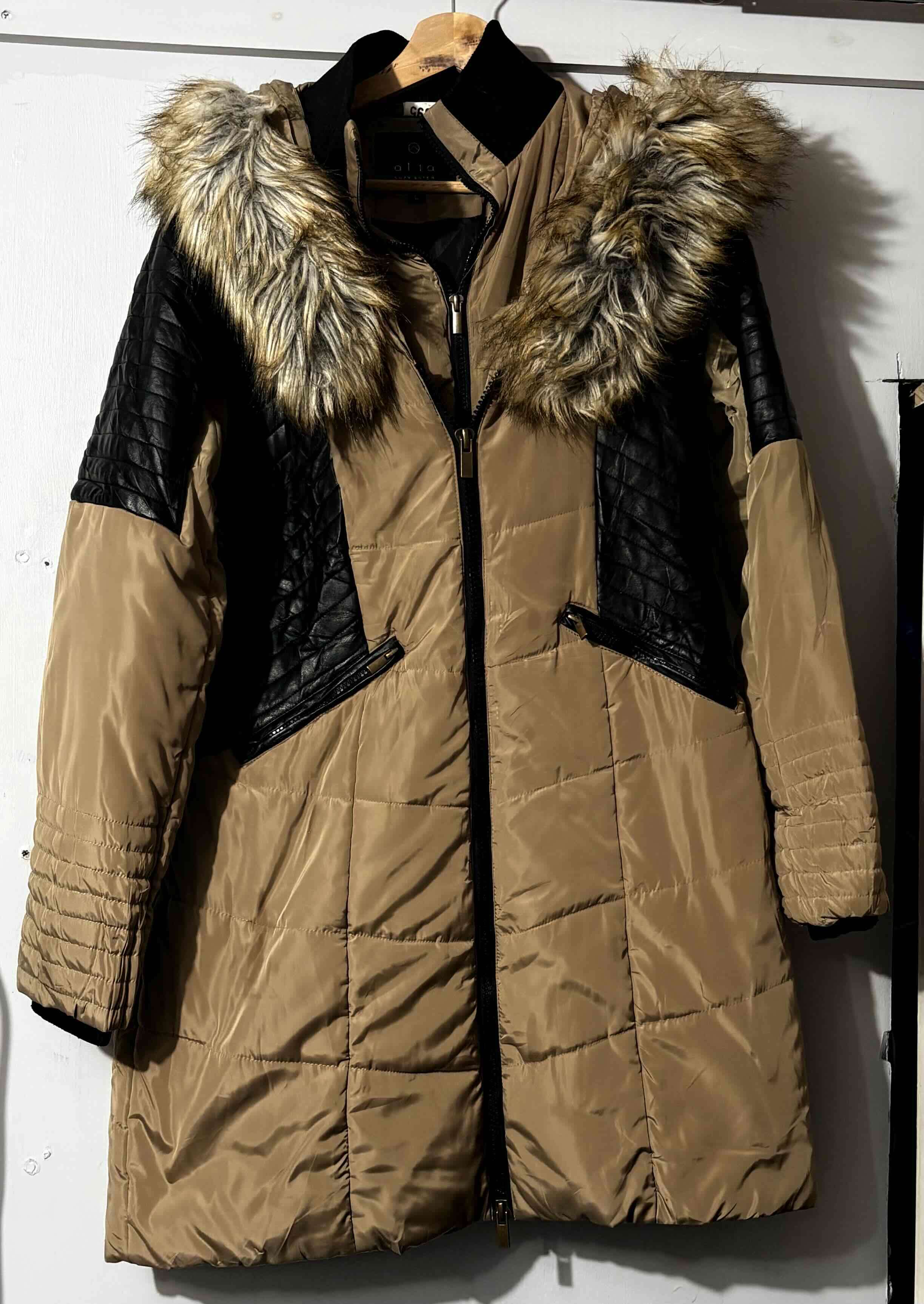 Parka cálido y elegante con capucha de piel sintética. Ideal para el invierno, en buen estado.talla s/m