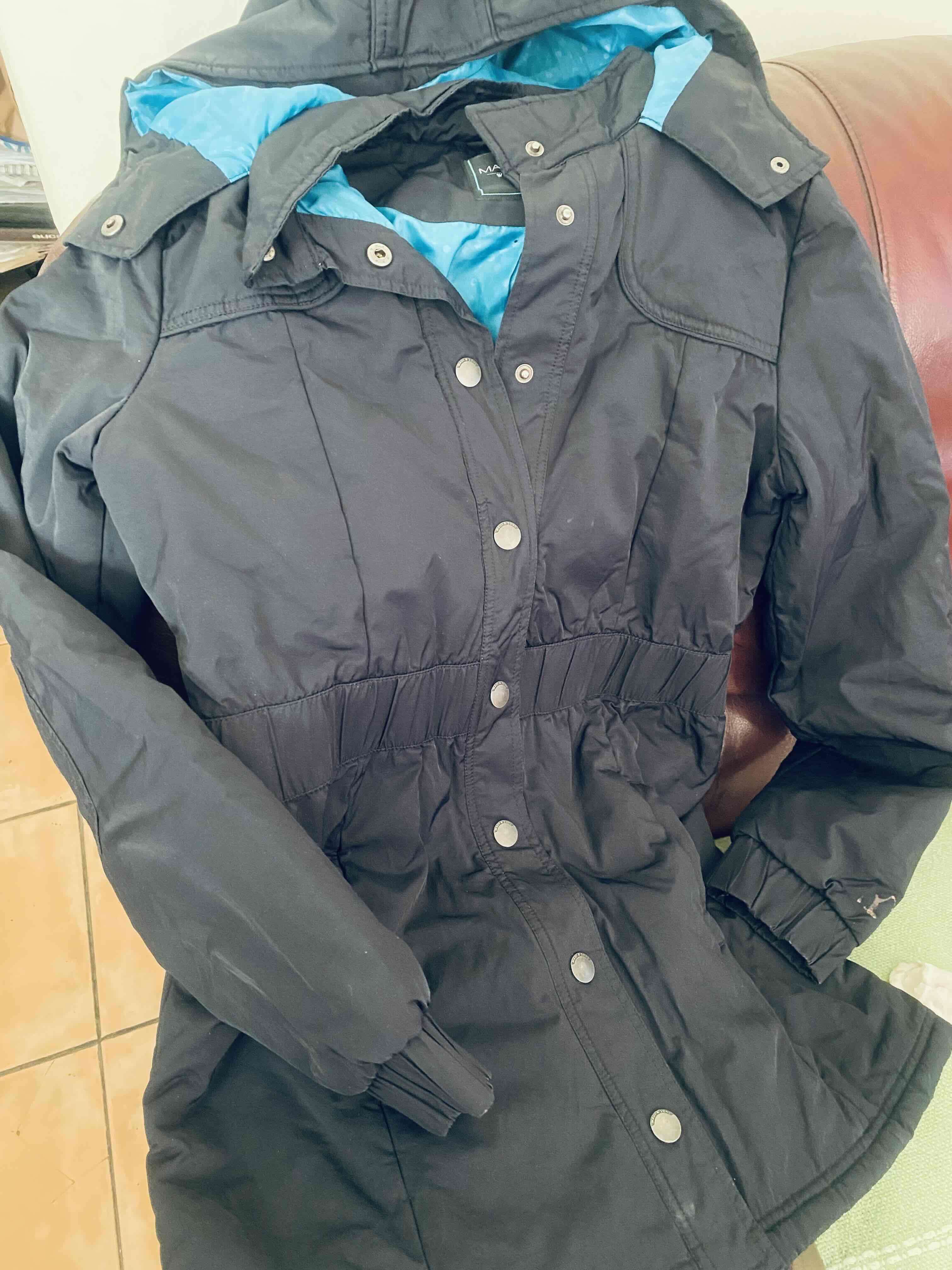 Parka azul para mujer, ideal para el invierno, con capucha ajustable En buen estado general.