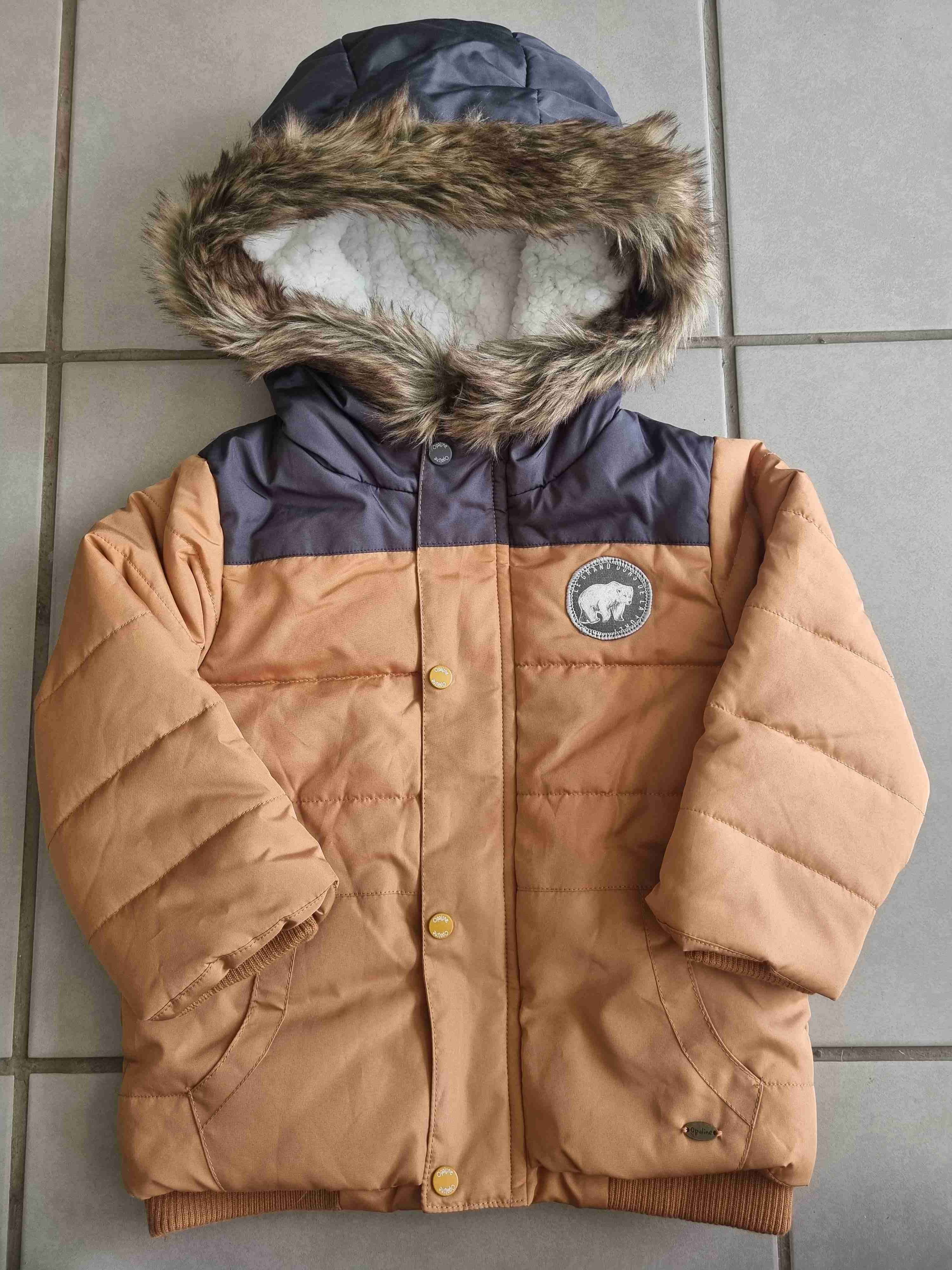 Parka acolchada para niño, color marrón y gris. Ideal para el invierno, con capucha y forro interno cálido. Marca Opaline, Talla 1 año (da para más). NUEVA.