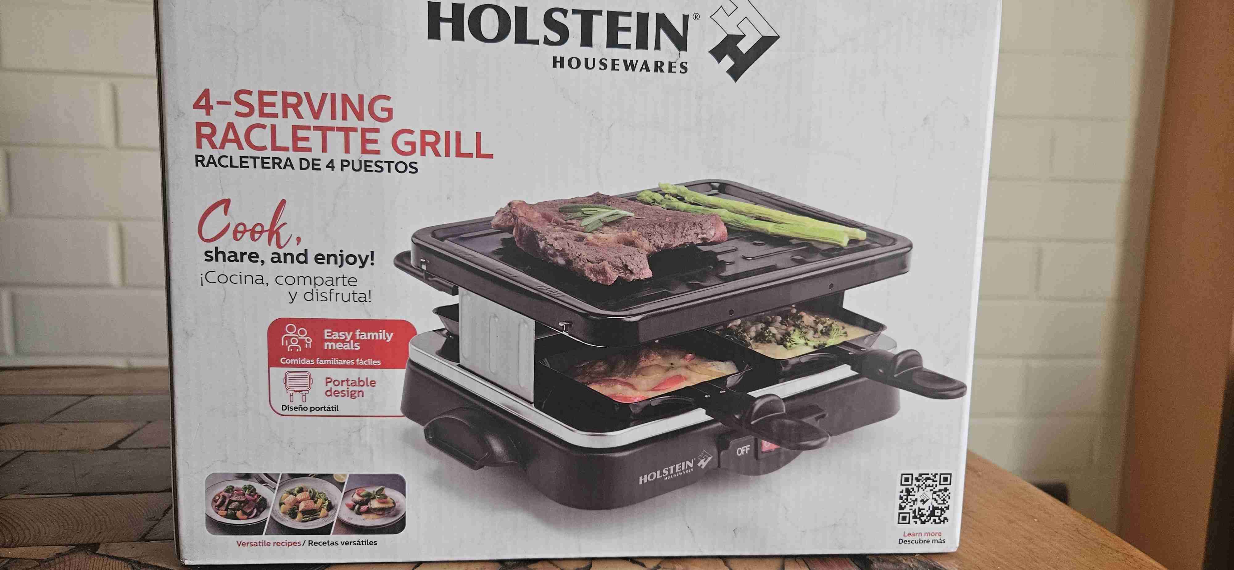 Raclettera eléctrica para 4 personas, ideal para cenas familiares. Estado nuevo, con diseño portátil y versátil.