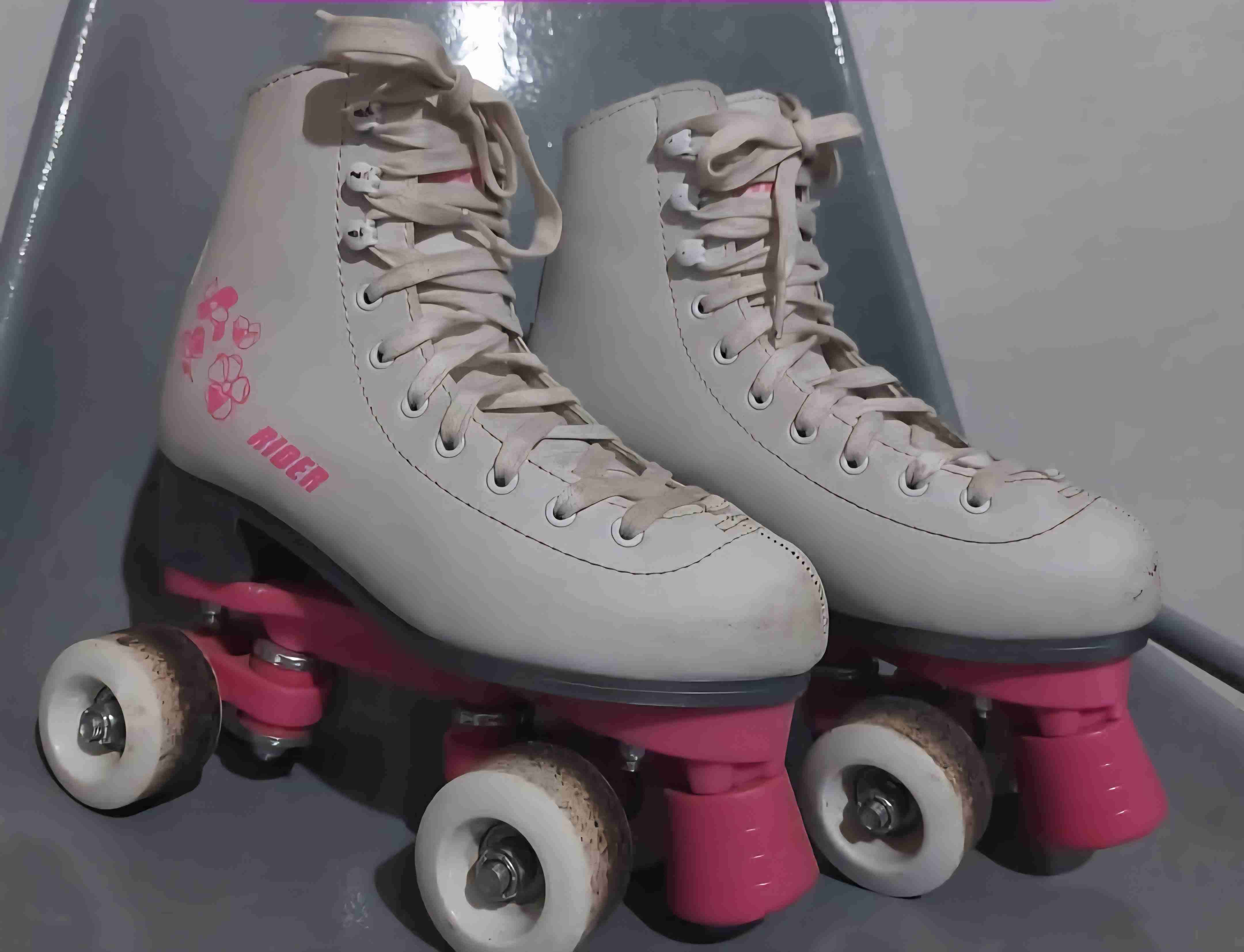 Patines de cuatro ruedas en buen estado, ideales para exteriores. Diseño en blanco con detalles rosas.
