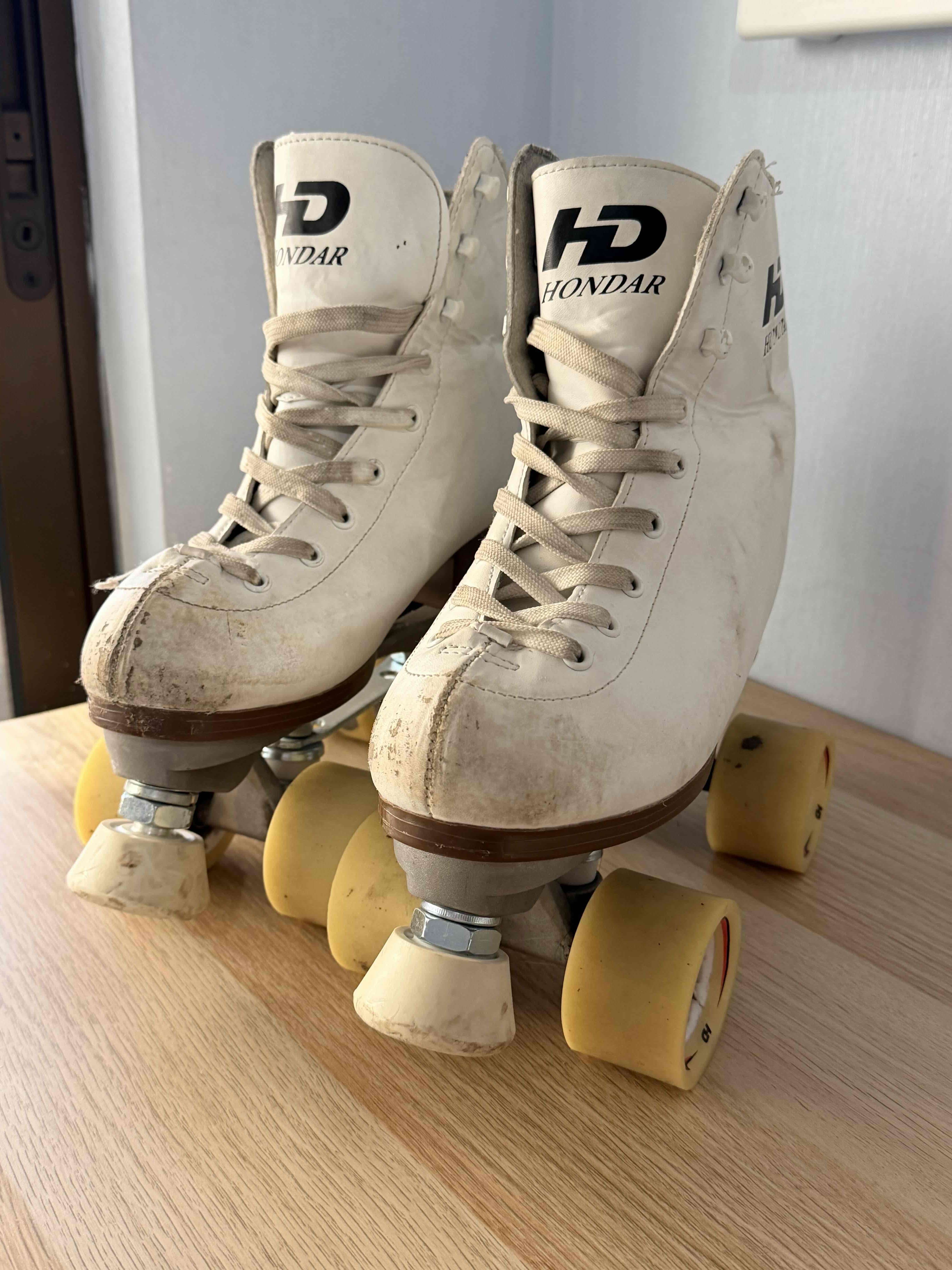 Patines de 4 ruedas marca Hondar en color blanco, en buen estado con signos de uso. Ideales para disfrutar al aire libre.