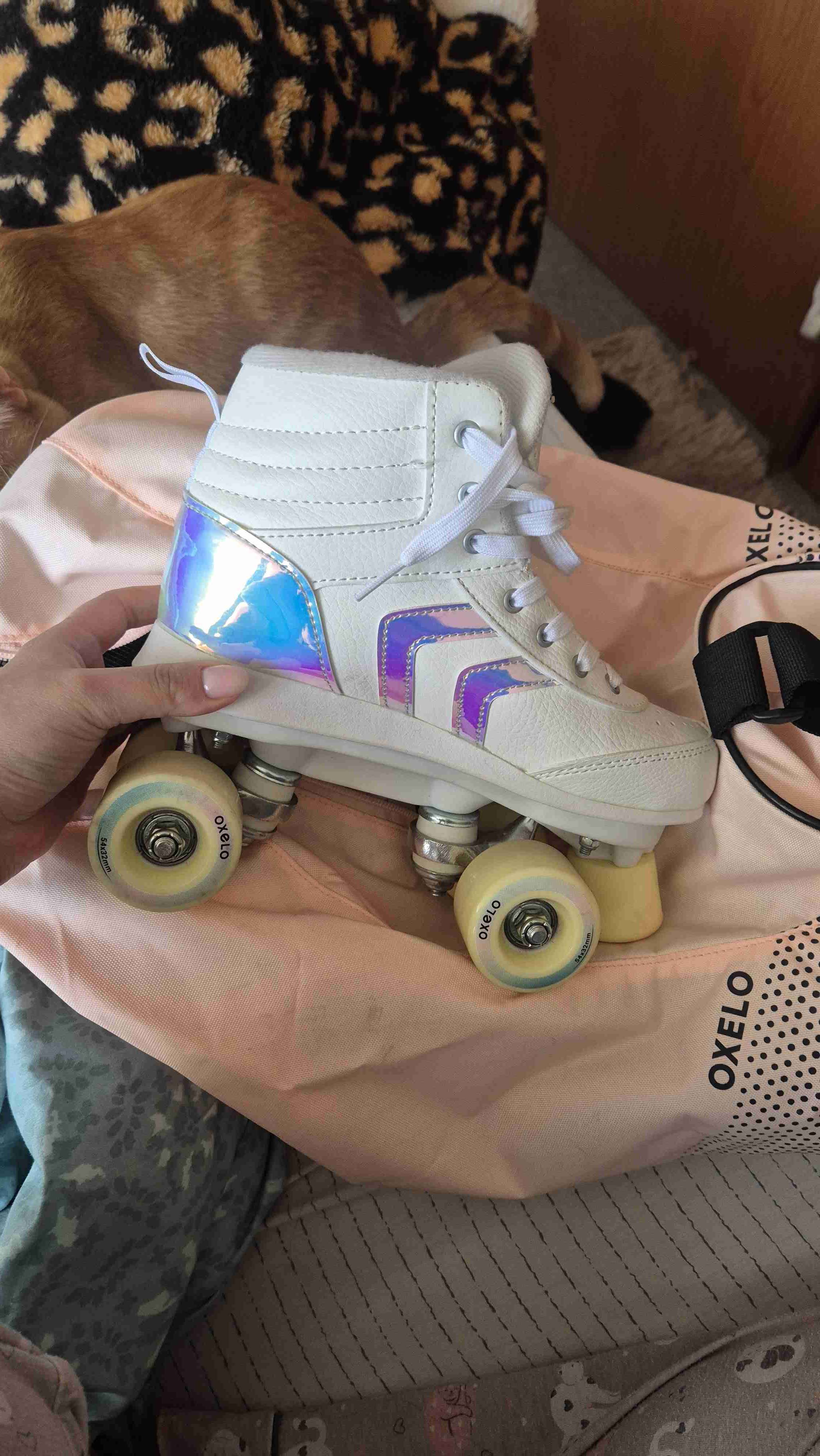 Patines de cuatro ruedas en buen estado, color blanco con detalles iridiscentes. Ideales para paseos y actividades recreativas. Talla 37. Incluye su bolso