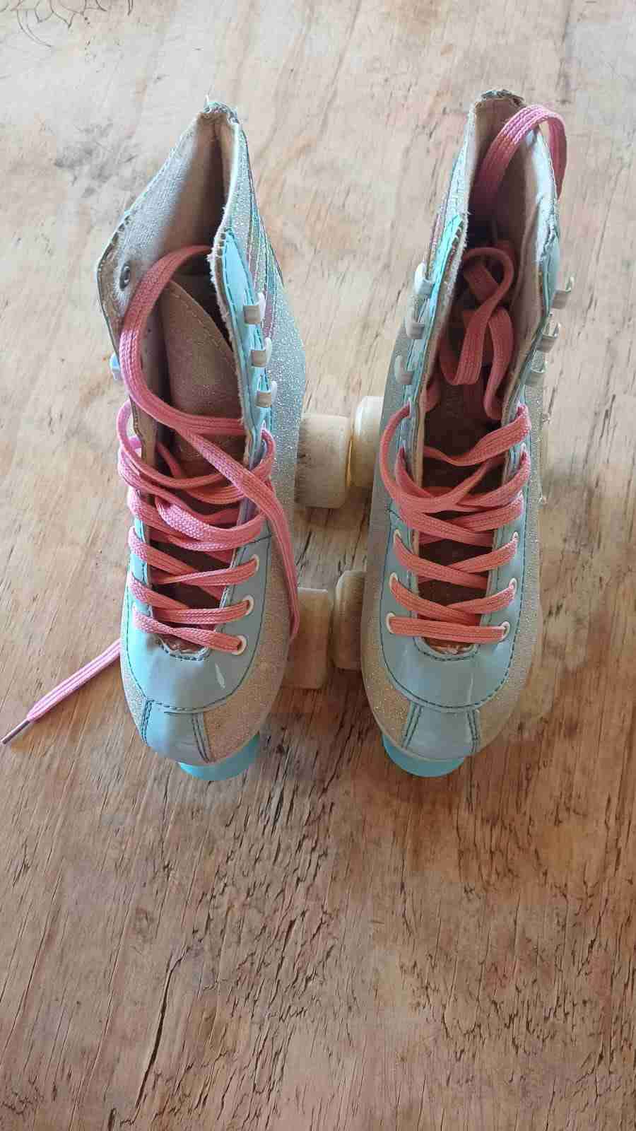 Patines de cuatro ruedas rosa celeste y gliter✨🩶🩵🩷