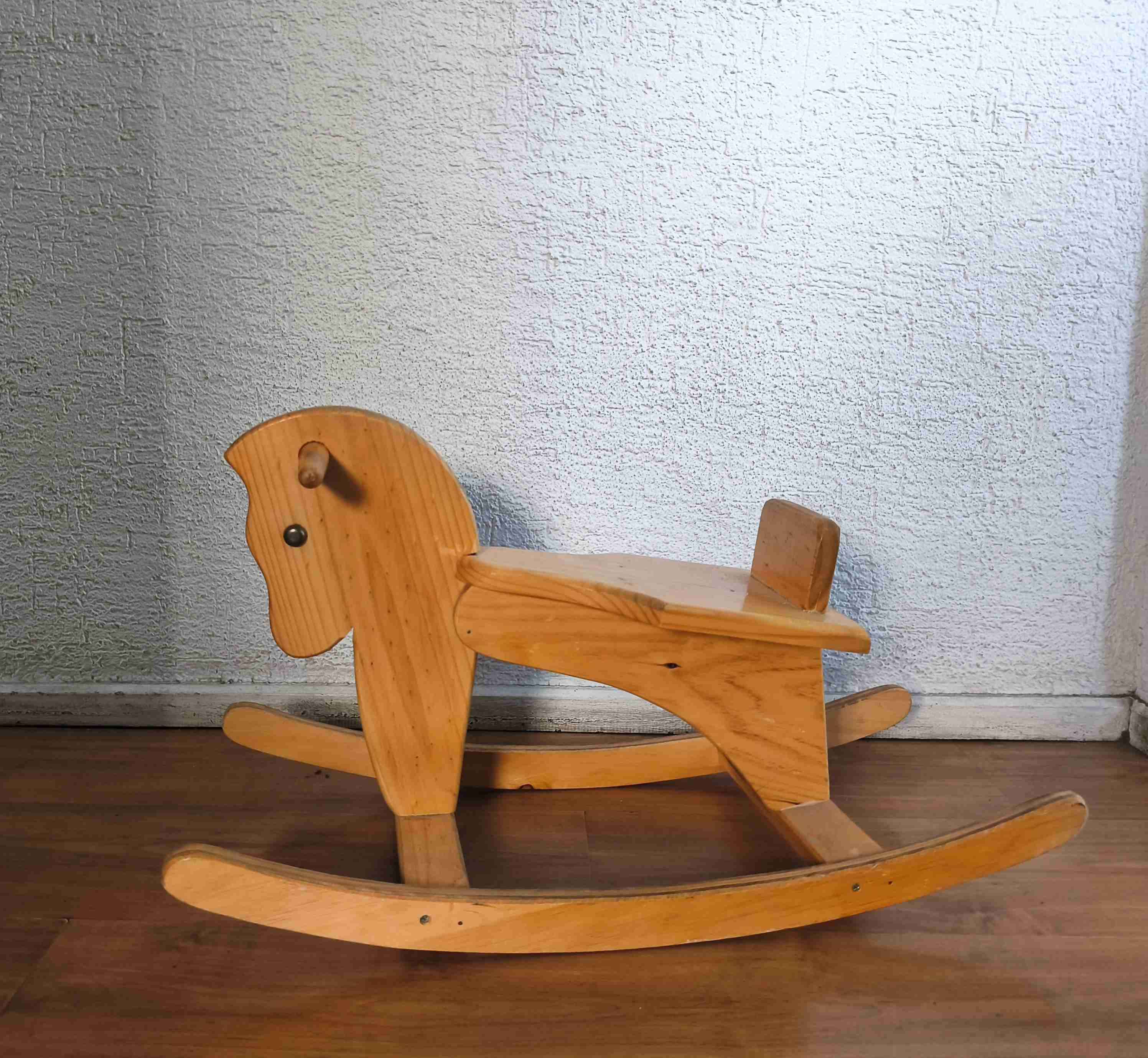 Caballito mecedor de madera en buen estado, ideal para niños pequeños. Diseño clásico y resistente, perfecto para el juego en casa.