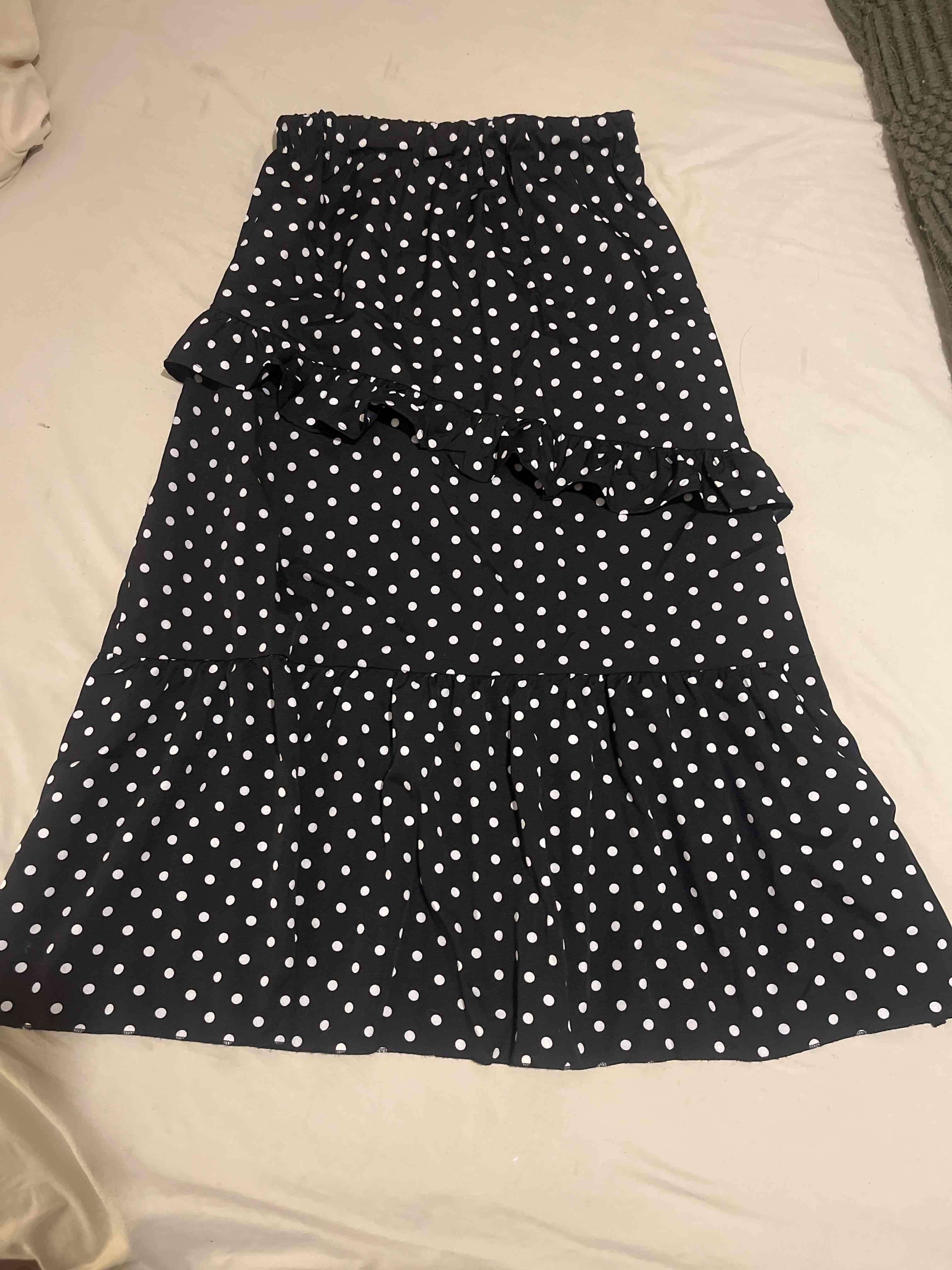 Hermosa falda larga negra con lunares blancos y vuelos, ideal para un look casual. En buen estado.