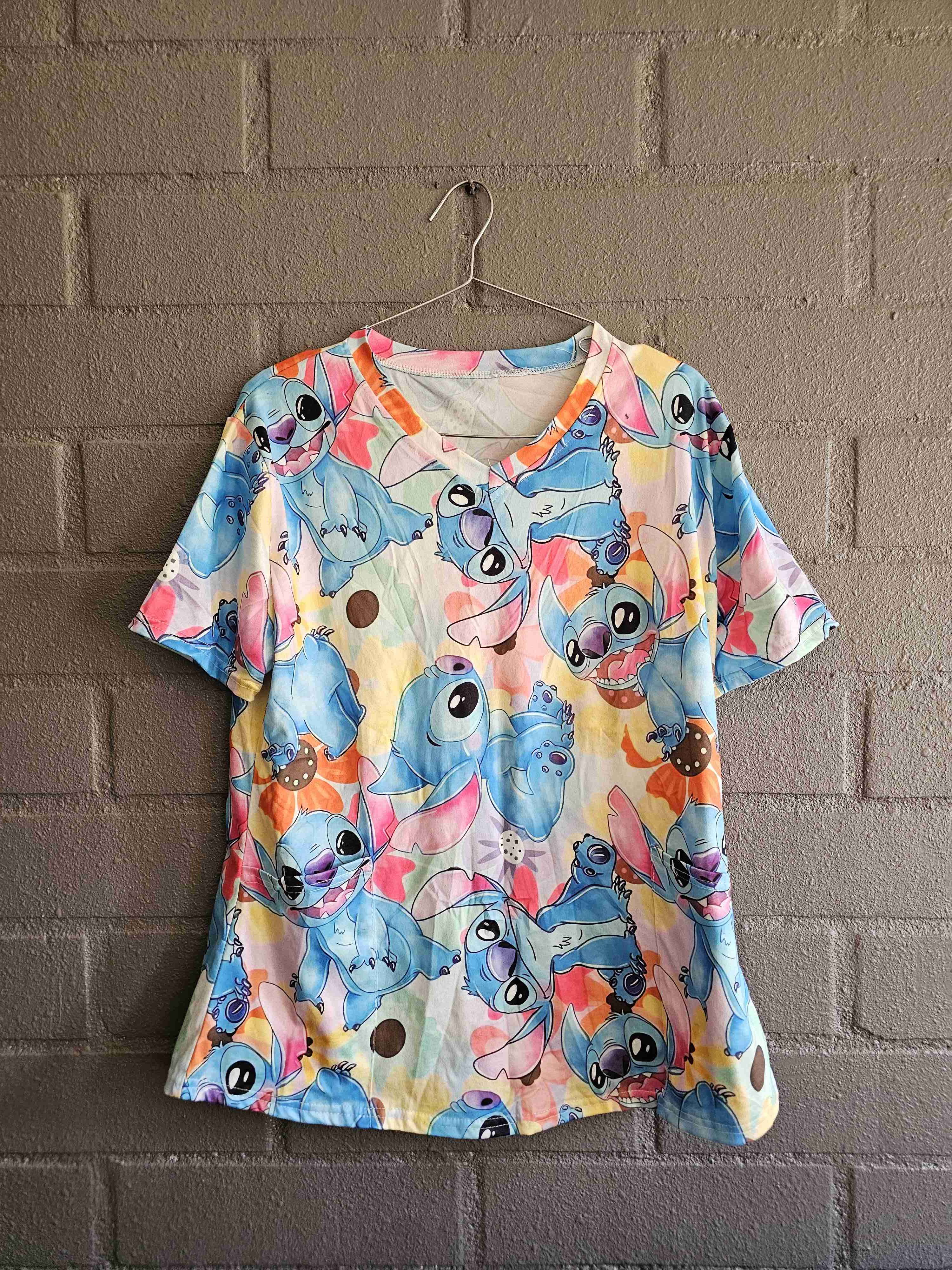 Pechera Clínica con diseño colorido de Stitch, ideal para fanáticos de Disney. Buen estado, perfecta para uso casual.