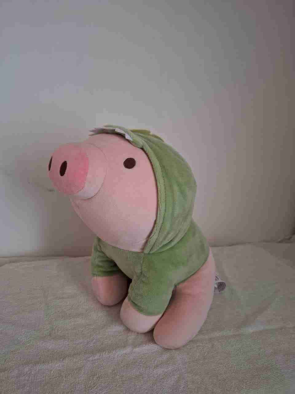 Peluche de cerdito con disfraz verde, suave y tierno, ideal para niños.
