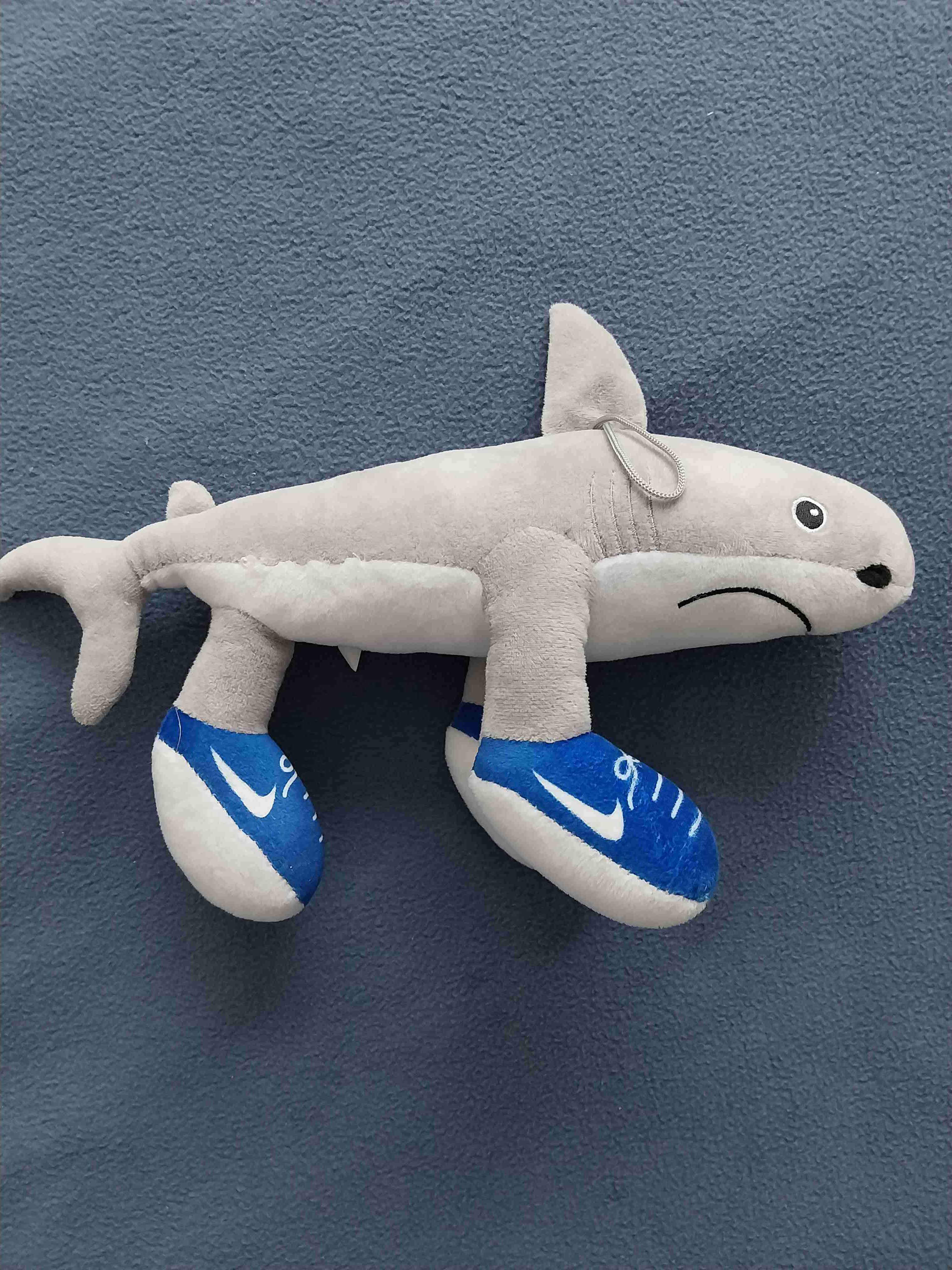 Peluche de tiburón gris con zapatos azules estilo deportivo.
