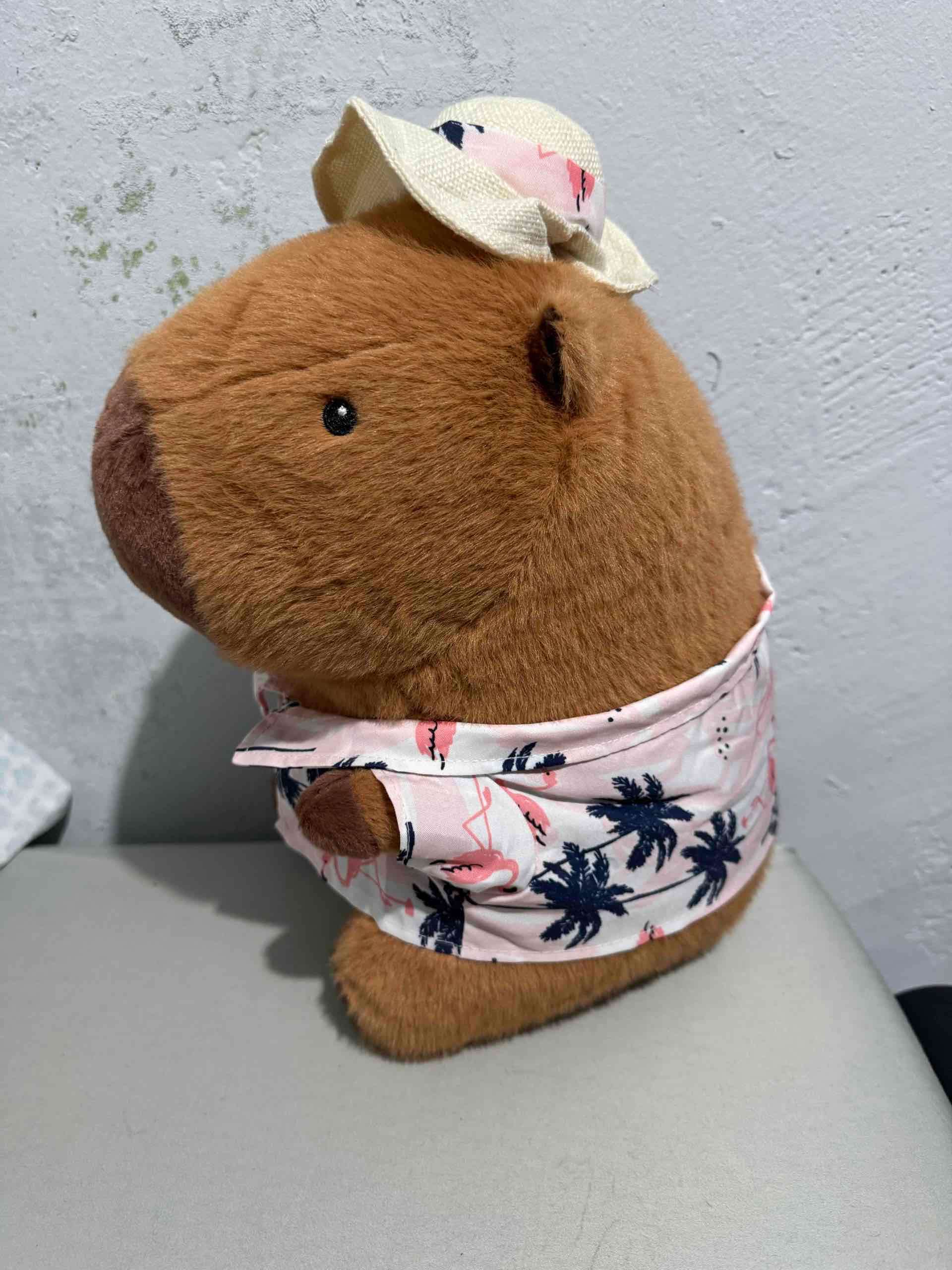 Peluchito adorable de capibara con sombrero y camisa hawaiana. Perfecto para decoración o regalos. Buen estado.