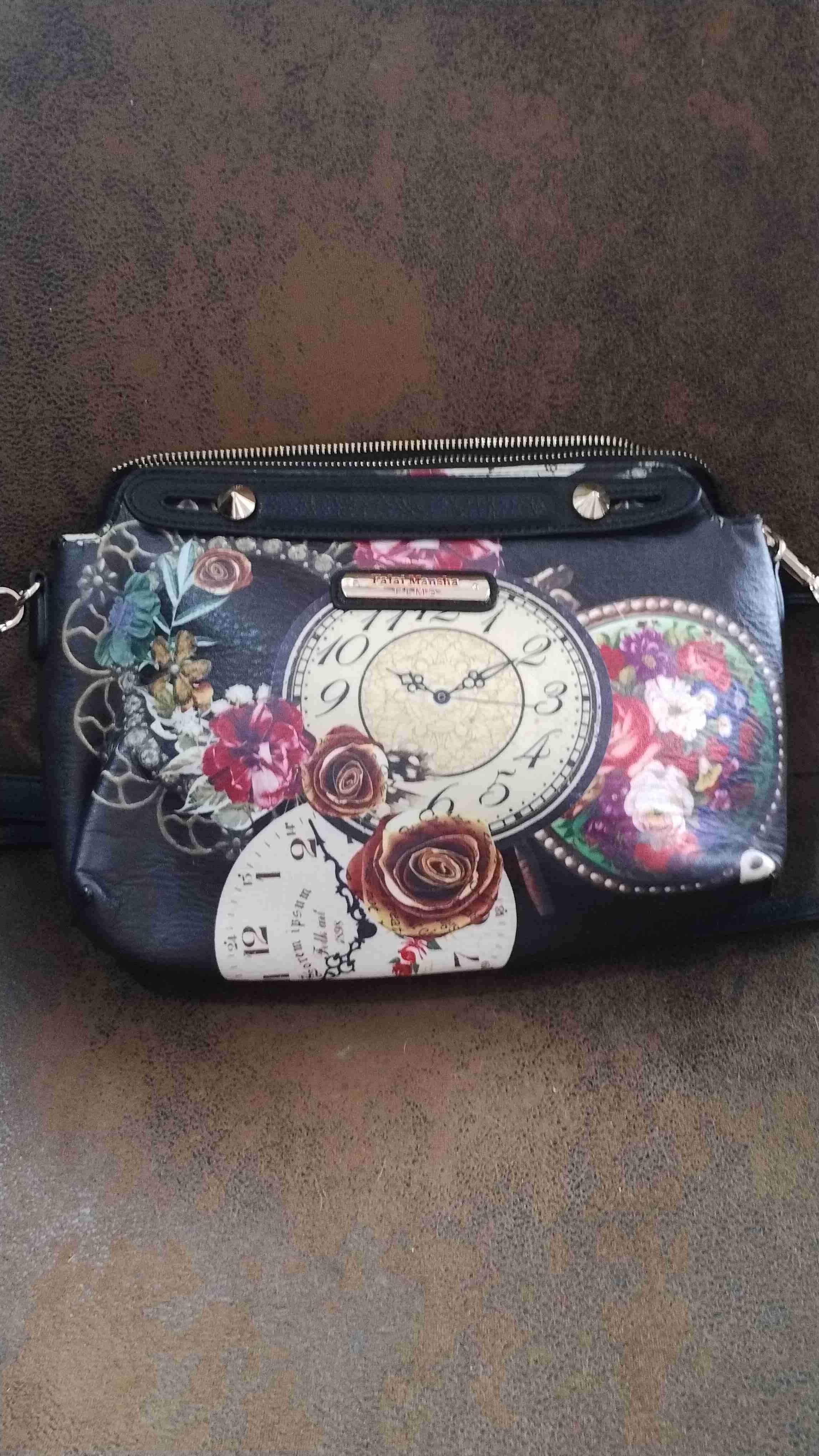 Cartera con diseño vintage de relojes y flores. Ideal para el uso diario, en buen estado general.