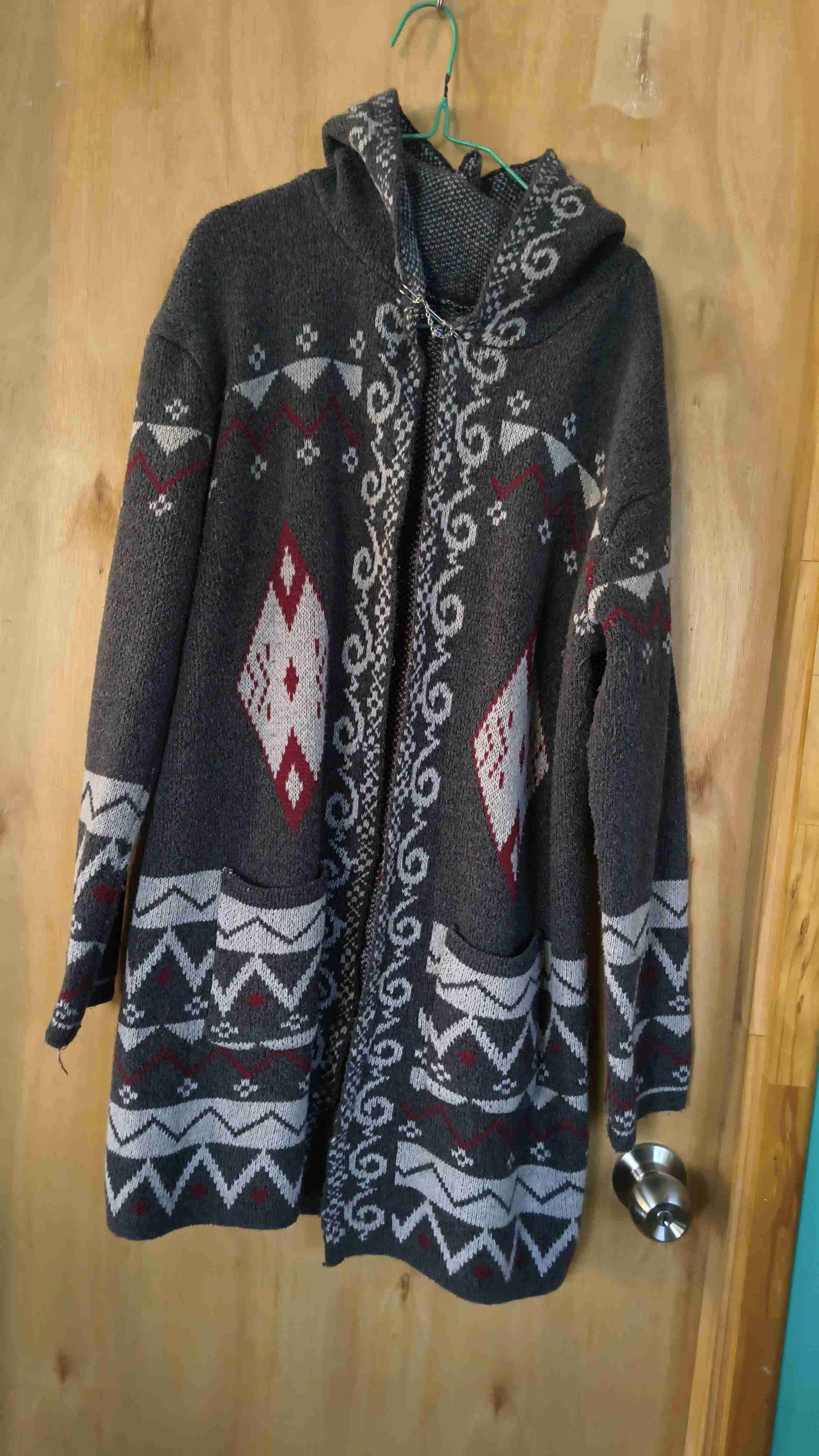 Chaleco largo con diseño étnico en tonos grises y rojos. Ideal para abrigarse en días fríos. En buen estado, cómodo y cálido.