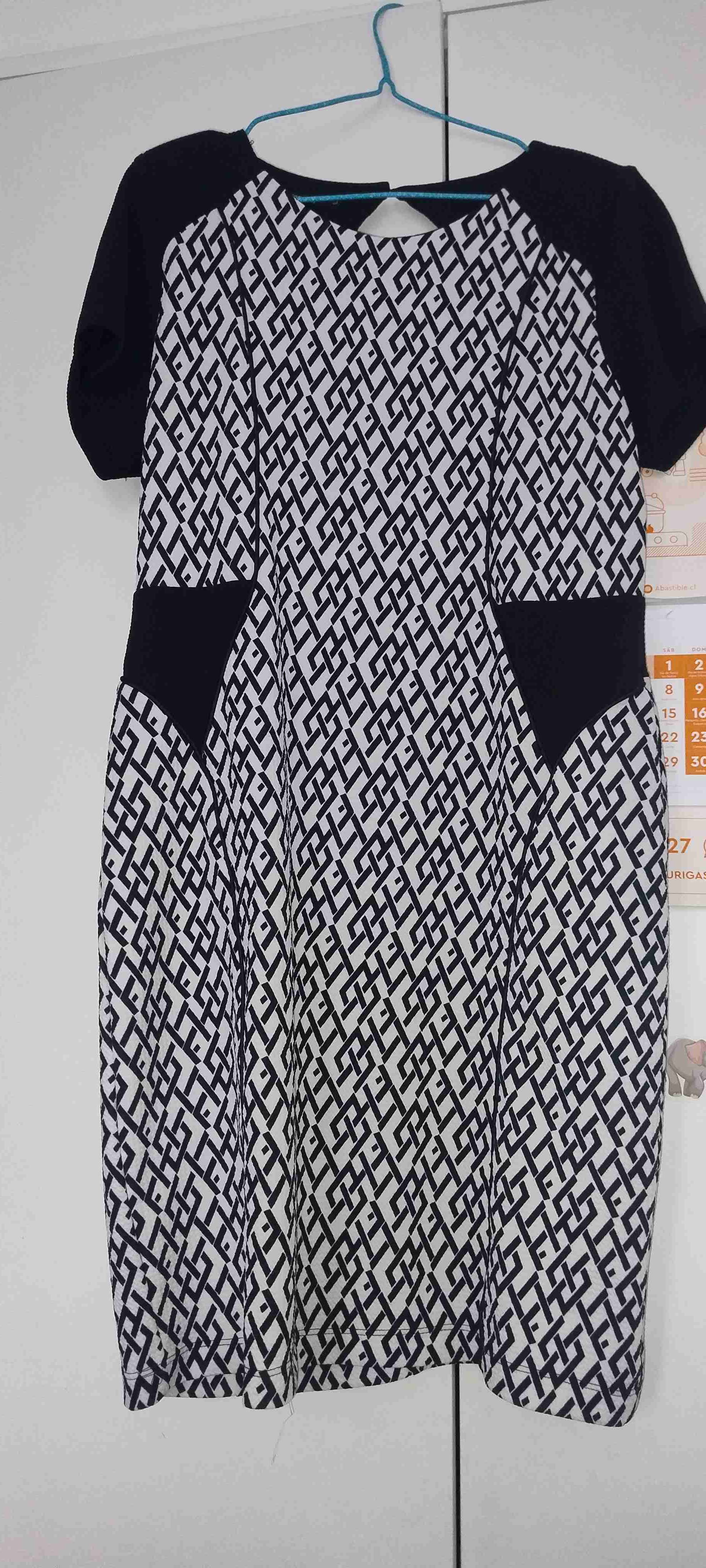 Vestido elegante con diseño geométrico en blanco y negro. Perfecto estado, ideal para eventos formales.