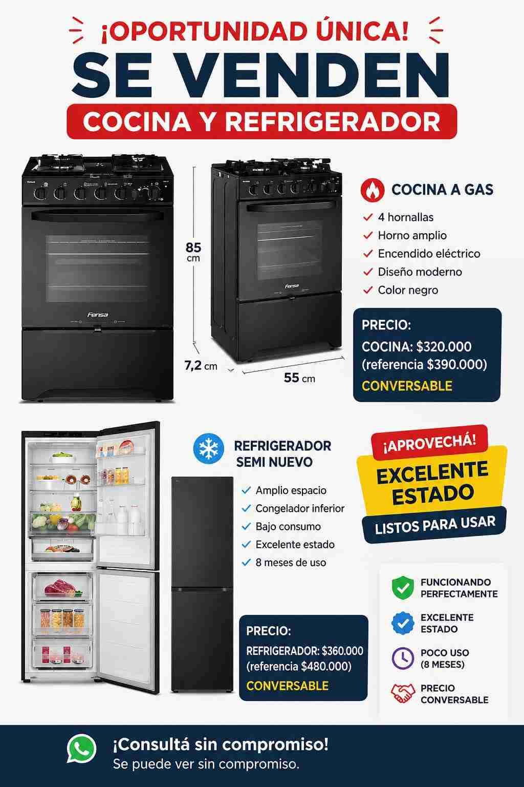 Cocina a gas de 4 hornallas y refrigerador con amplio espacio. Ambos en excelente estado y poco uso.