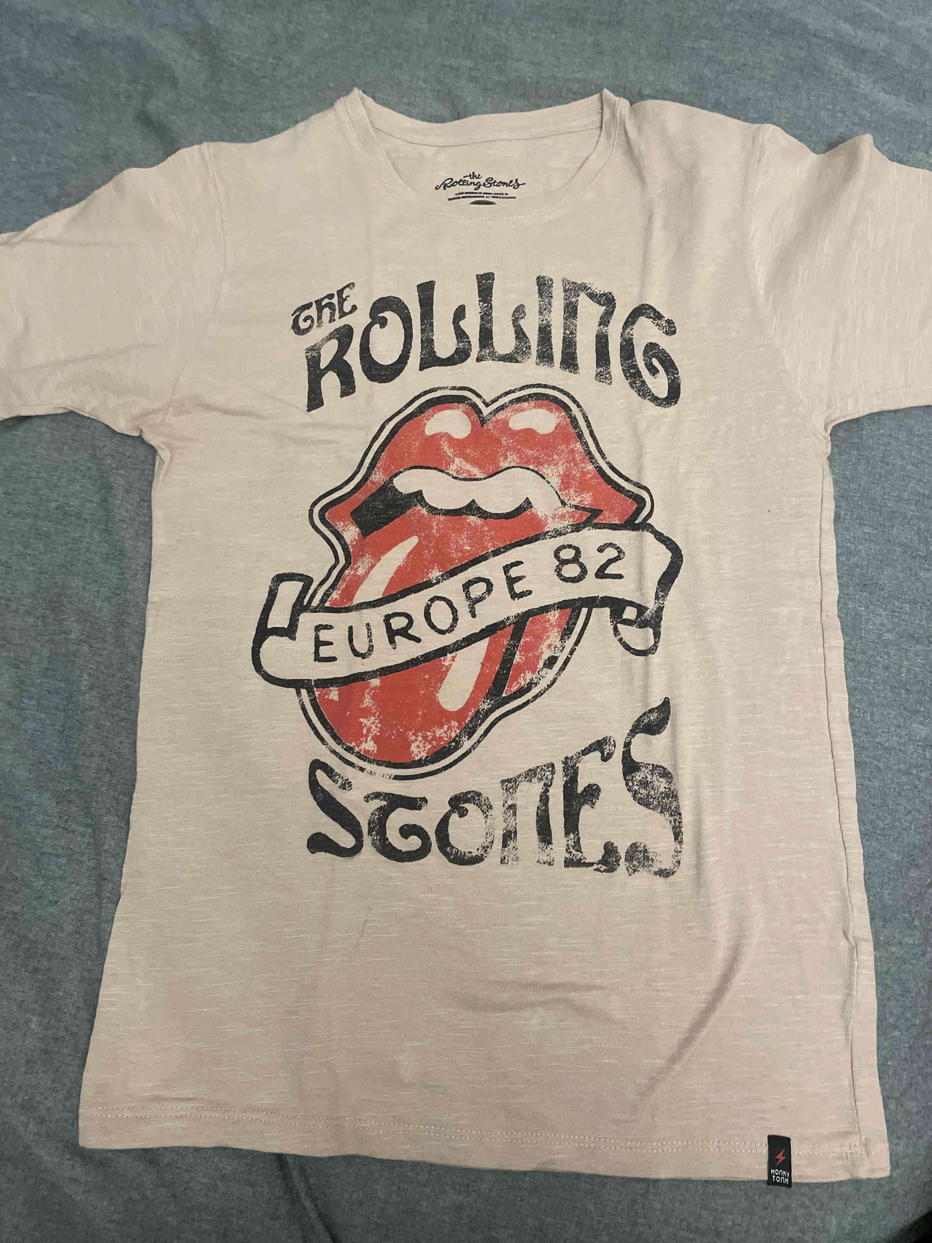 Polera beige con estampado Rolling Stones, estilo vintage. Excelente estado, ideal para fans de la banda. Marca Honky Tonk (Argentina)