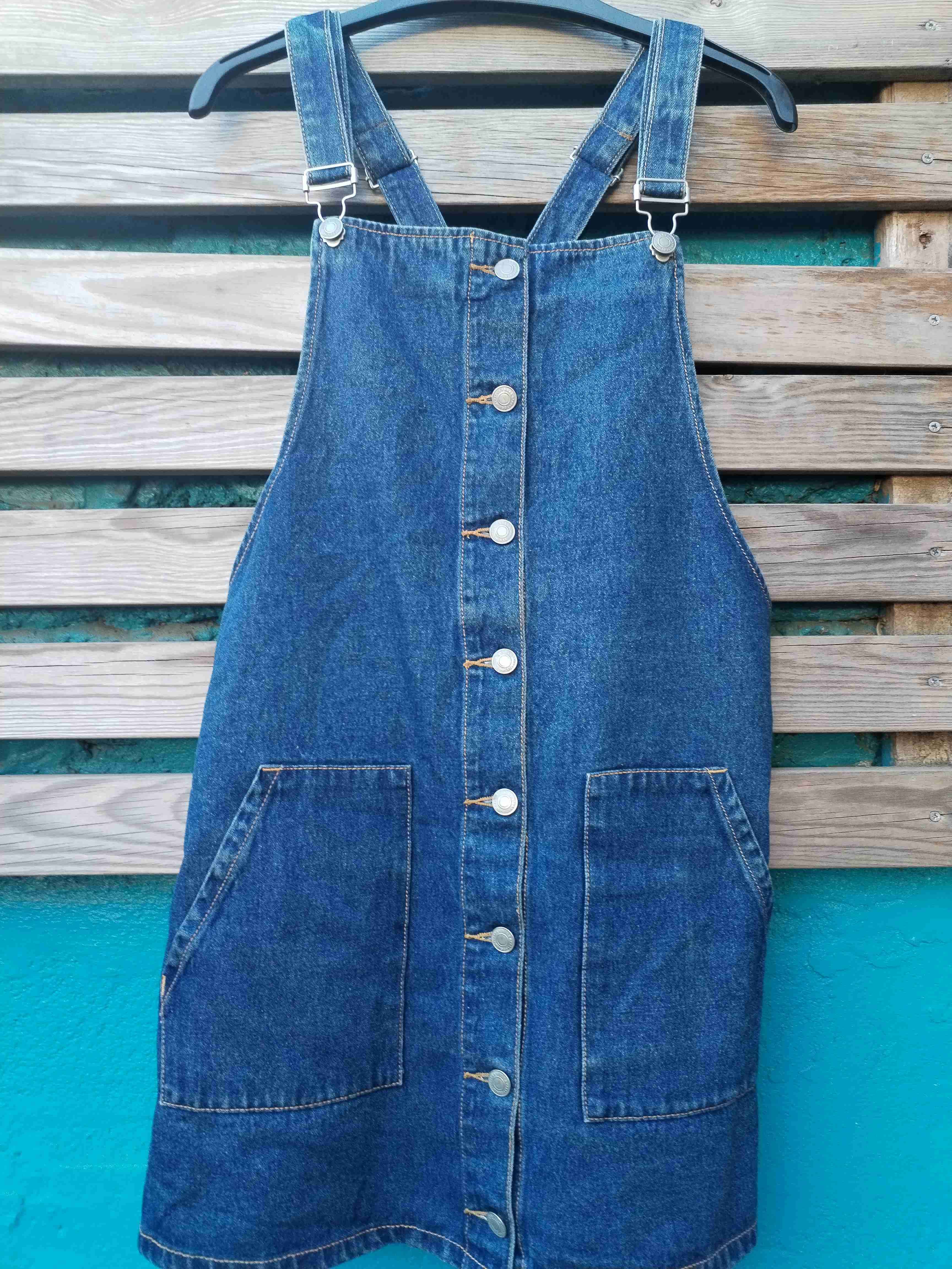 Jardinera de mezclilla azul con botones y tirantes ajustables. Ideal para un look casual. En buen estado.