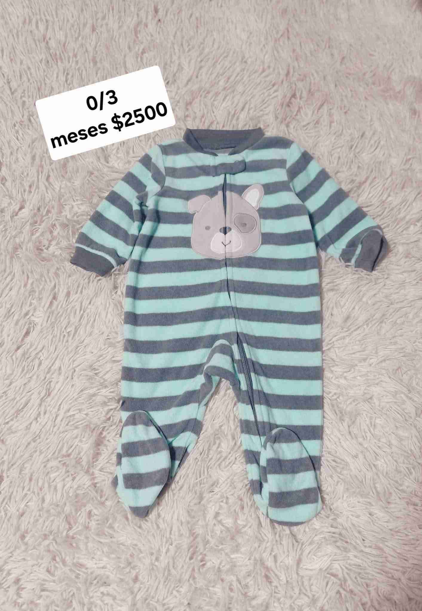 Pijama de algodón para bebé, rayado azul y gris con diseño de osito. Ideal para mantener abrigado a tu bebé en las noches frías, de micropolar. Usado pero de aspecto nuevo.