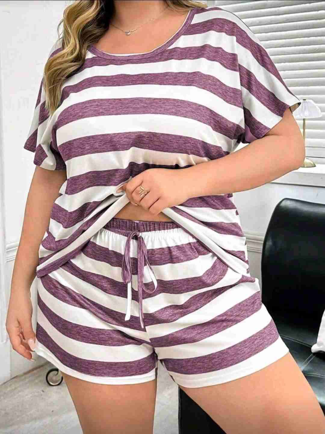 Cómodo pijama de rayas moradas, ideal para dormir o descansar en casa.