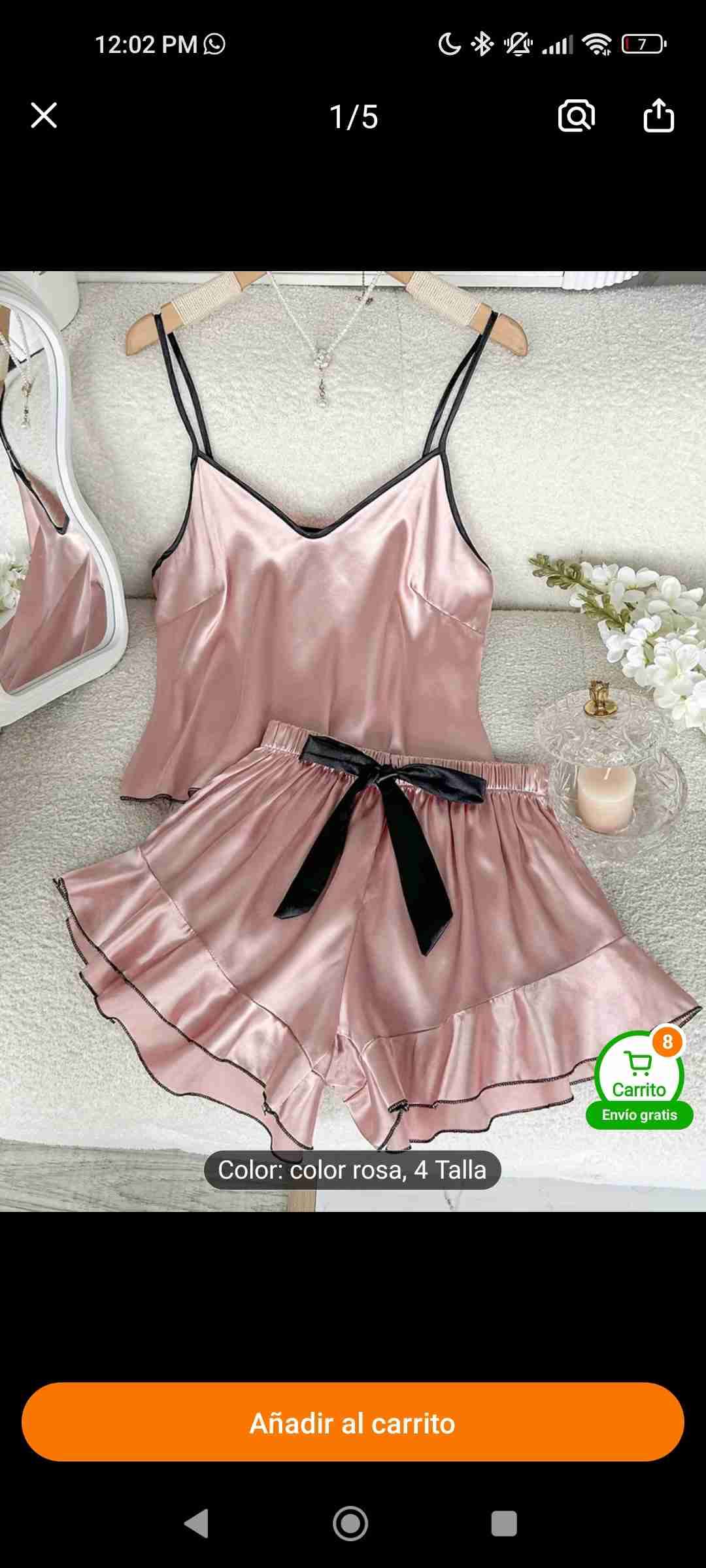Conjunto de pijama en satén rosa, cómodo y elegante. Perfecto para una noche relajada en casa.