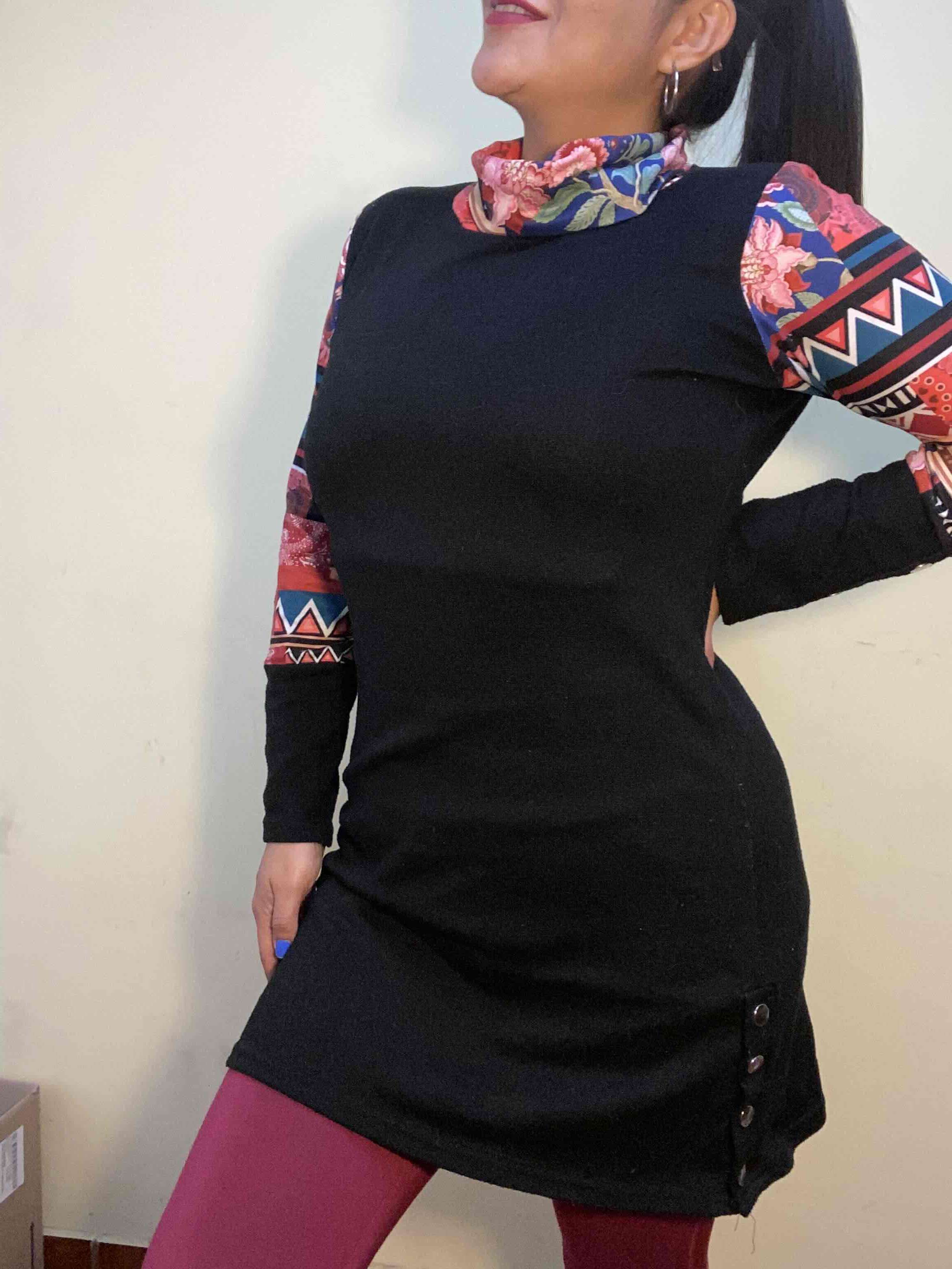 Vestido negro de cuello alto con mangas estampadas coloridas, ideal para otoño. Buen estado general. Talla standard