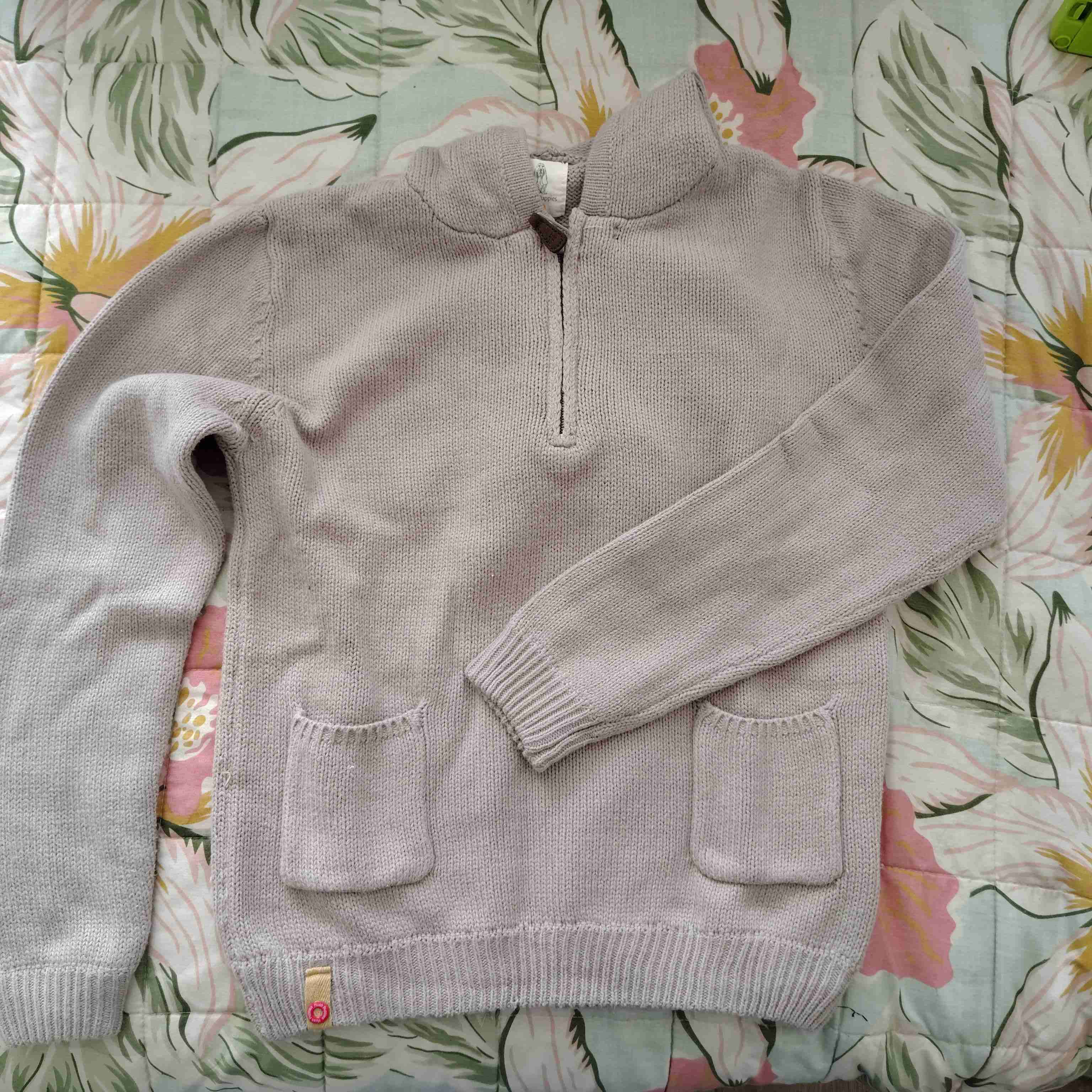 Chaleco de punto color beige con medio cierre y bolsillos frontales. Ideal para días frescos. En buen estado general. Talla 10
