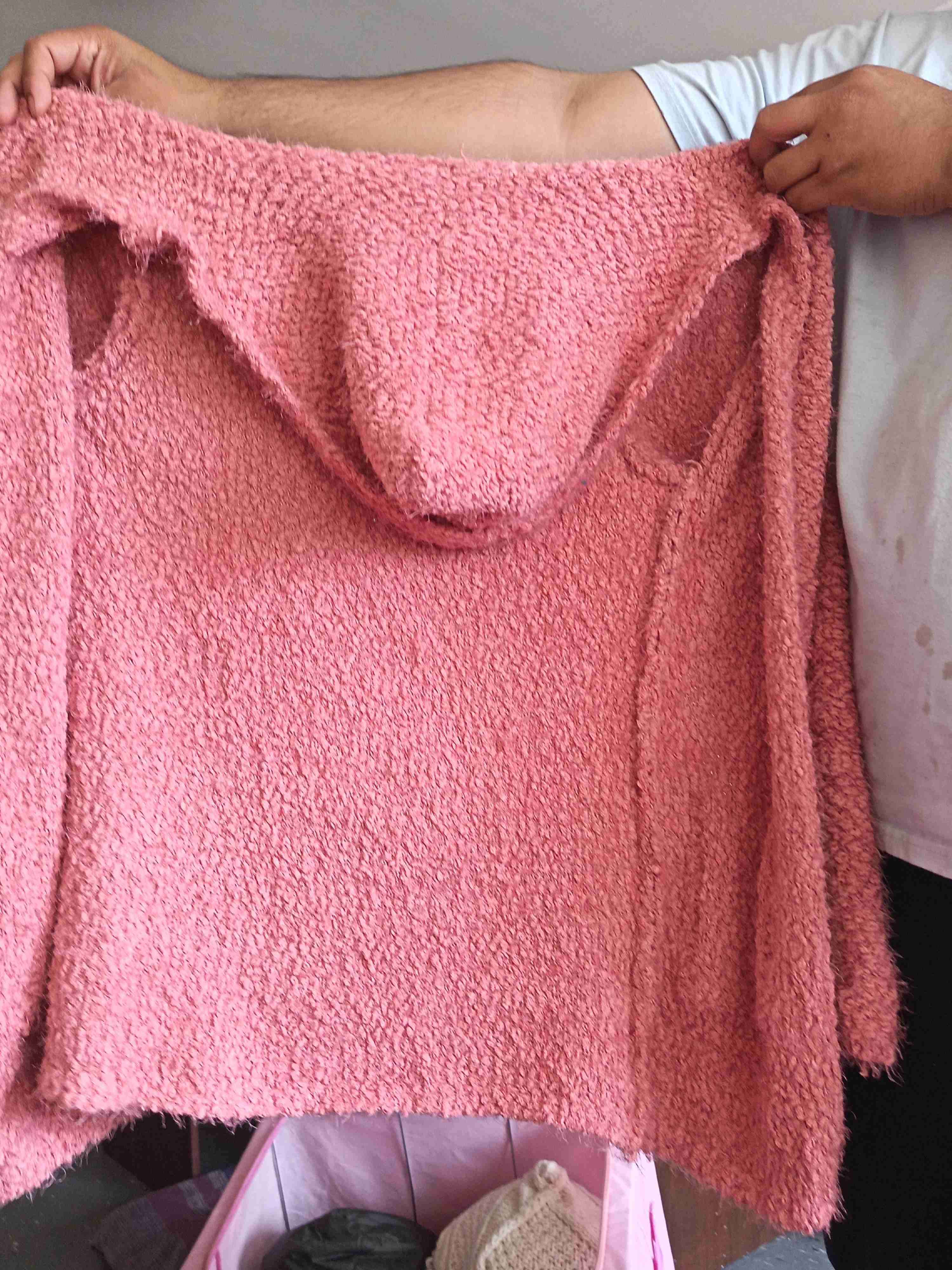 Cálida capa tejida a mano en color rosa. Perfecta para días frescos, suave y acogedora. En buen estado.